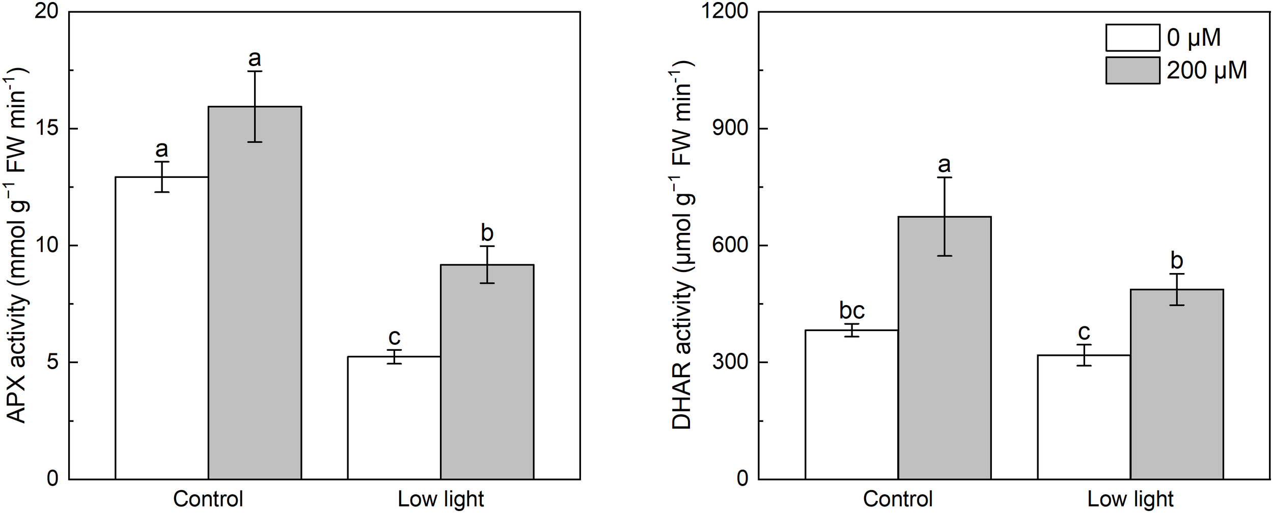 Effect of melatonin application on the activity of ascorbate peroxidase (APX) and dehydroascorbate reductase (DHAR) in tobacco seedlings under low light. Different letters represent significant differences at the P < 0.05 level. Values are means ± SE (n = 3).