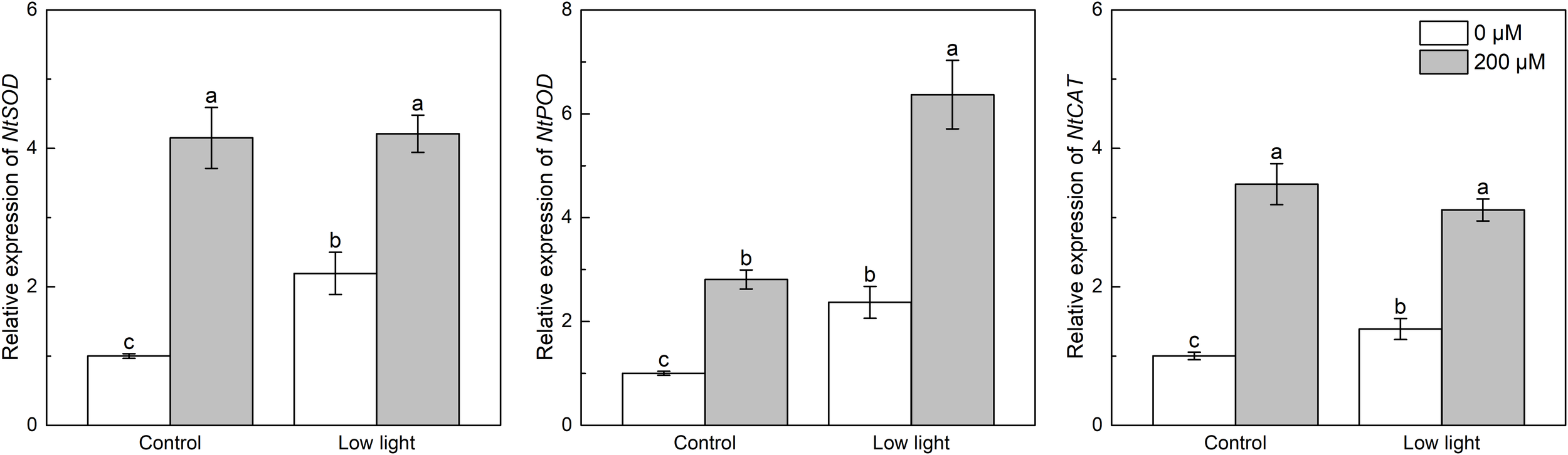 Under control light intensity, melatonin spraying significantly increased the expression level of NtSOD, NtPOD and NtCAT (Figure 5). NtSOD, NtPOD and NtCAT expressions were significantly higher in low light-affected seedlings compared with those seedlings under control light intensity (Figure 5). Moreover, NtSOD, NtPOD and NtCAT expressions were promoted by the addition of melatonin in the low light-affected tobacco seedlings.