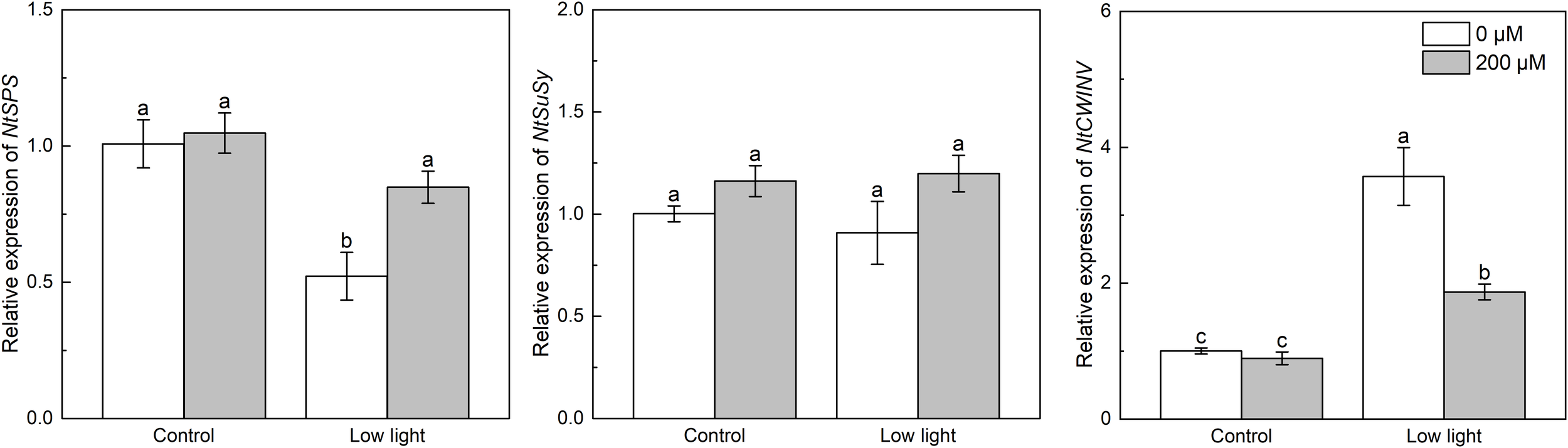 Effect of melatonin application on the expression of genes NtSPS, NtSuSy and NtCWINV encoding sucrose phosphate synthase, sucrose synthase, and cell wall invertase, respectively, in tobacco seedlings under low light. Different letters represent significant differences at the P < 0.05 level. Values are means ± SE (n = 3).