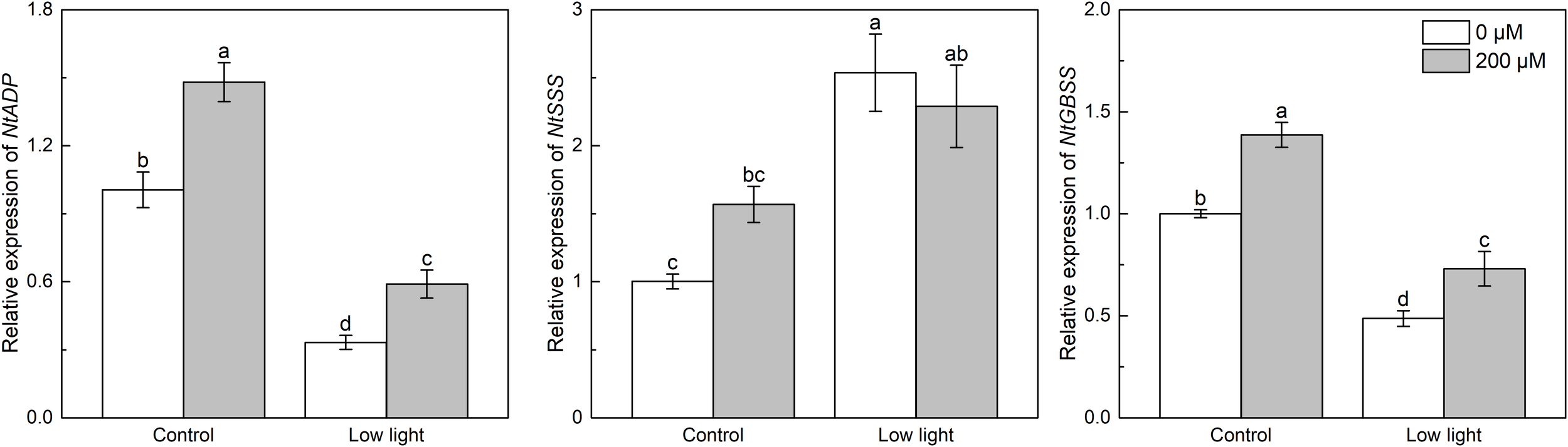 Effect of melatonin application on the expression of genes NtADP, NtSSS and NtGBSS encoding ADP-glucose pyrophosphorylase, soluble starch synthase and granule-bound starch synthase, respectively, in tobacco seedlings under low light. Different letters represent significant differences at the P < 0.05 level. Values are means ± SE (n = 3).