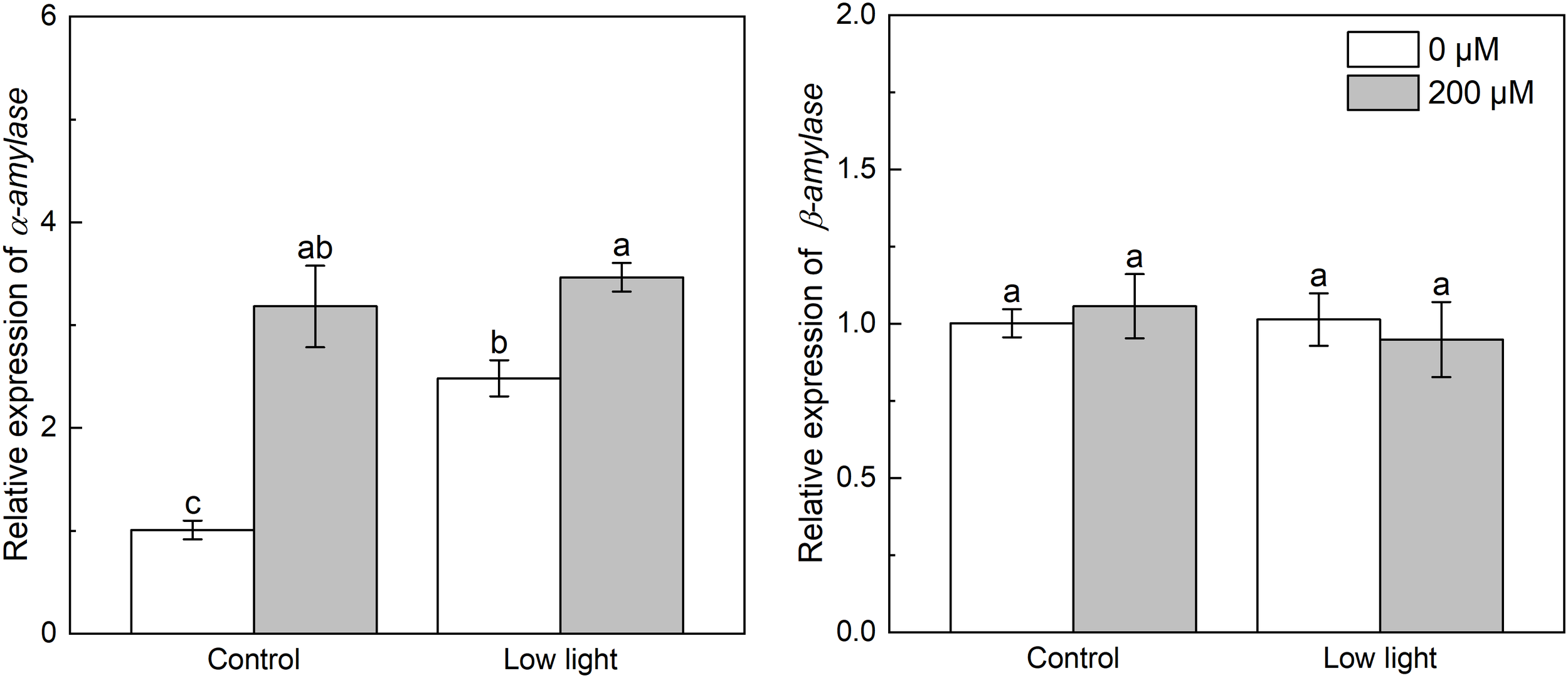 Effect of melatonin application on the expression of genes α-amylase and β-amylase encoding α- and β-amylase, respectively, in tobacco seedlings under low light. Different letters represent significant differences at the P < 0.05 level. Values are means ± SE (n = 3).