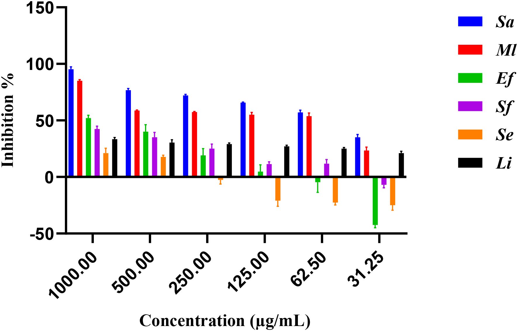 The antimicrobial activity of E. billardieri extract against Gram-positive bacteria is shown in Figure 2. The results indicate a concentration-dependent inhibition, with higher concentrations yielding greater effectiveness. Among the tested Gram-positive strains, Staphylococcus aureus and Micrococcus luteus demonstrated the highest sensitivity, with low IC50 values of 57.47 µg/mL and 105.8 µg/mL, respectively (Table 1). In contrast, Enterococcus faecalis, Streptococcus faecalis, and Staphylococcus epidermis showed relatively higher IC50 values (804 µg/mL, 1223 µg/mL, and 1892 µg/mL, respectively), indicating moderate resistance. Listeria innocua displayed the highest IC50 value (67.245 µg/mL), suggesting that it is the least susceptible Gram-positive species tested.