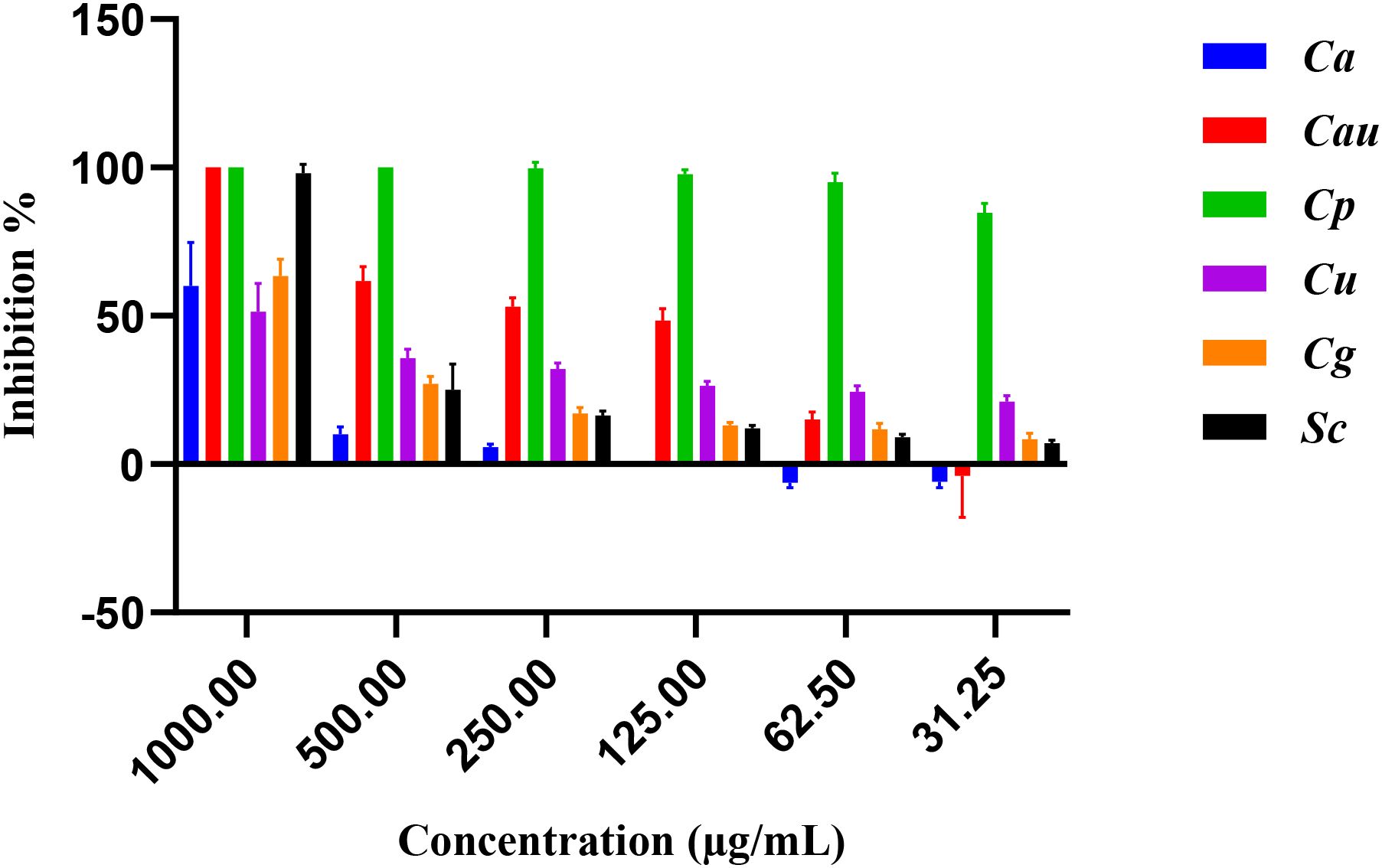 The extract was tested against six yeasts (Candida albicans, Candida auris, Candida parapsilosis, Candida utilis, Candida glabrata, Saccharomyces cerevisiae), six Gram-positive bacteria (Staphylococcus aureus, Micrococcus luteus, Enterococcus faecalis, Streptococcus faecalis, Staphylococcus epidermidis, Listeria innocua), and nine Gram-negative bacteria (Escherichia coli, Pseudomonas aeruginosa, Aeromonas hydrophila, Shigella flexneri, Shigella sonnei, Acinobacter baumanii, Enterobacter aerogenes, Brevundimonas diminuta, Salmonella enteritidis). The test organisms used in this study were sourced from the American Type Culture Collection (ATCC) and are stored in our laboratory’s freezer/fridge for future use. The antimicrobial activity was assessed using a broth microdilution assay following the method described by Hu et al., 2023. Briefly, yeast cultures were grown in YPD medium (1% yeast extract, 2% peptone, and 2% dextrose), while bacterial cultures were grown in Mueller–Hinton (MH) medium (0.2% beef extract, 1.75% casamino acids, and 0.015% soluble starch). Under aseptic conditions, 5 μL of bacterial cultures (1×106 CFU/mL) and 10 μL of yeast cultures (1×105 CFU/mL) were inoculated in 96-well plates along with 10 μL of the test sample, solvent control (DMSO), and positive controls (miconazole at 200 μg/mL and ciprofloxacin at 100 μg/mL). The test organisms were adjusted to an optical density (OD) of 0.003 for bacteria and 0.001 for fungi and incubated at 37 °C for 20 hours. Miconazole (for fungi) and ciprofloxacin (for Gram-positive and Gram-negative bacteria) were included as positive controls (Hu et al., 2023). The inhibition values were calculated using the following Equation 1: