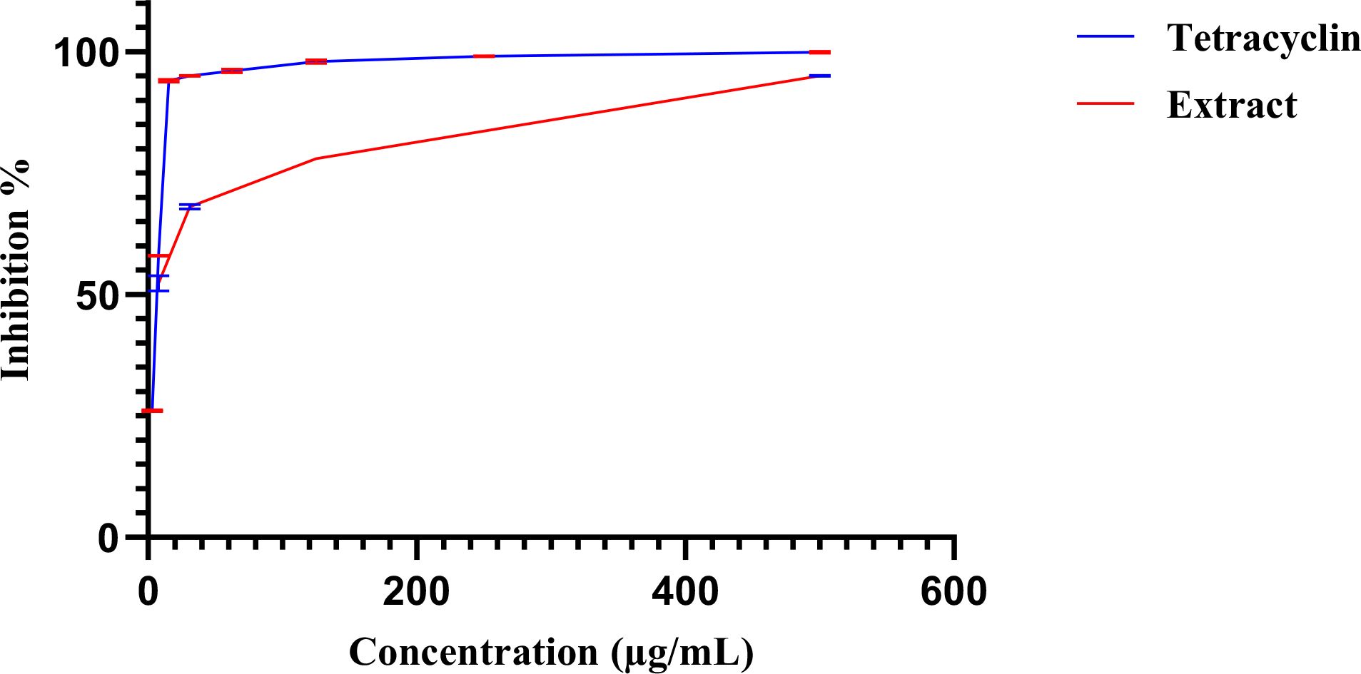 Figure 5. Dose–response curves of biofilm inhibition by the extract (red) and tetracycline (blue). Error bars, shown in the different color as each curve.