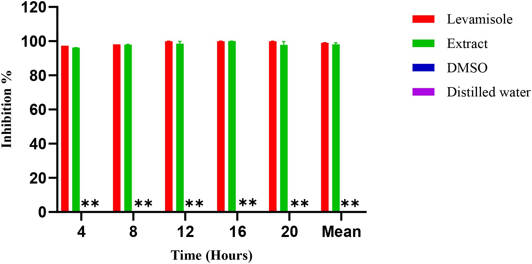Figure 6. Inhibition (%) over time for Levamisole (positive control), Extract, DMSO, and Distilled water (negative controls). **: DMSO and distilled water show 0% inhibition at all time points and, therefore, appear as baseline bars.