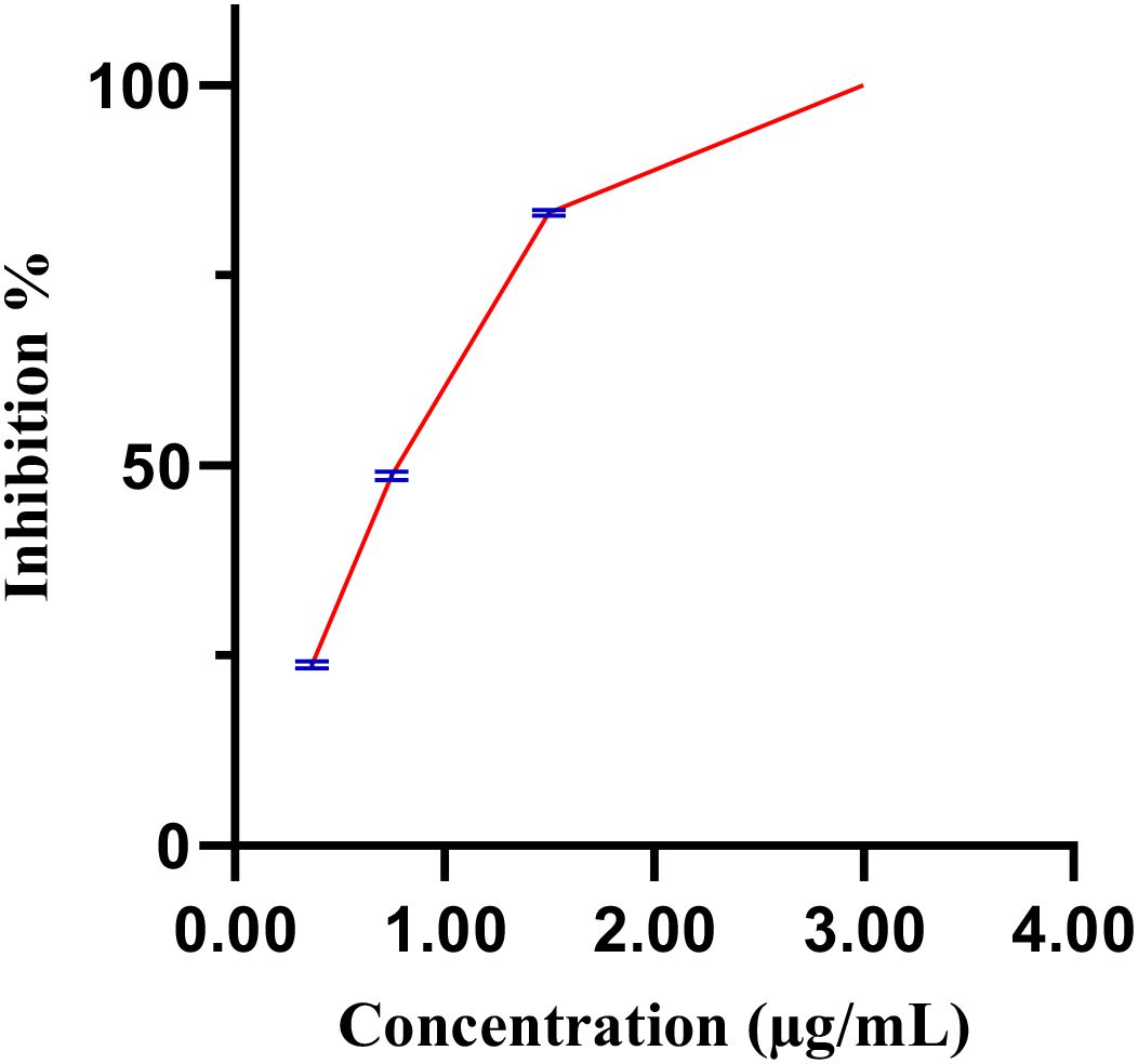 Figure 6 illustrates the inhibition percentages of C. elegance L4 larval mobility induces by the methanol extract over time. At a concentration of 2.0 µg/mL, the methanol extract completely inhibited larval mobility (97.7 ± 1.5%), closely mirroring the effect of the positive control, levamisole (99.1 ± 1.78%). In contrast, neither 1.5% DMSO nor distilled water (negative control) affected larval mobility. Decreasing the extract concentration from 3 µg/mL to 0.37 µg/mL resulted in a progressive reduction in inhibitory effects, with an estimated IC50 of 0.89 µg/mL (Figure 7).