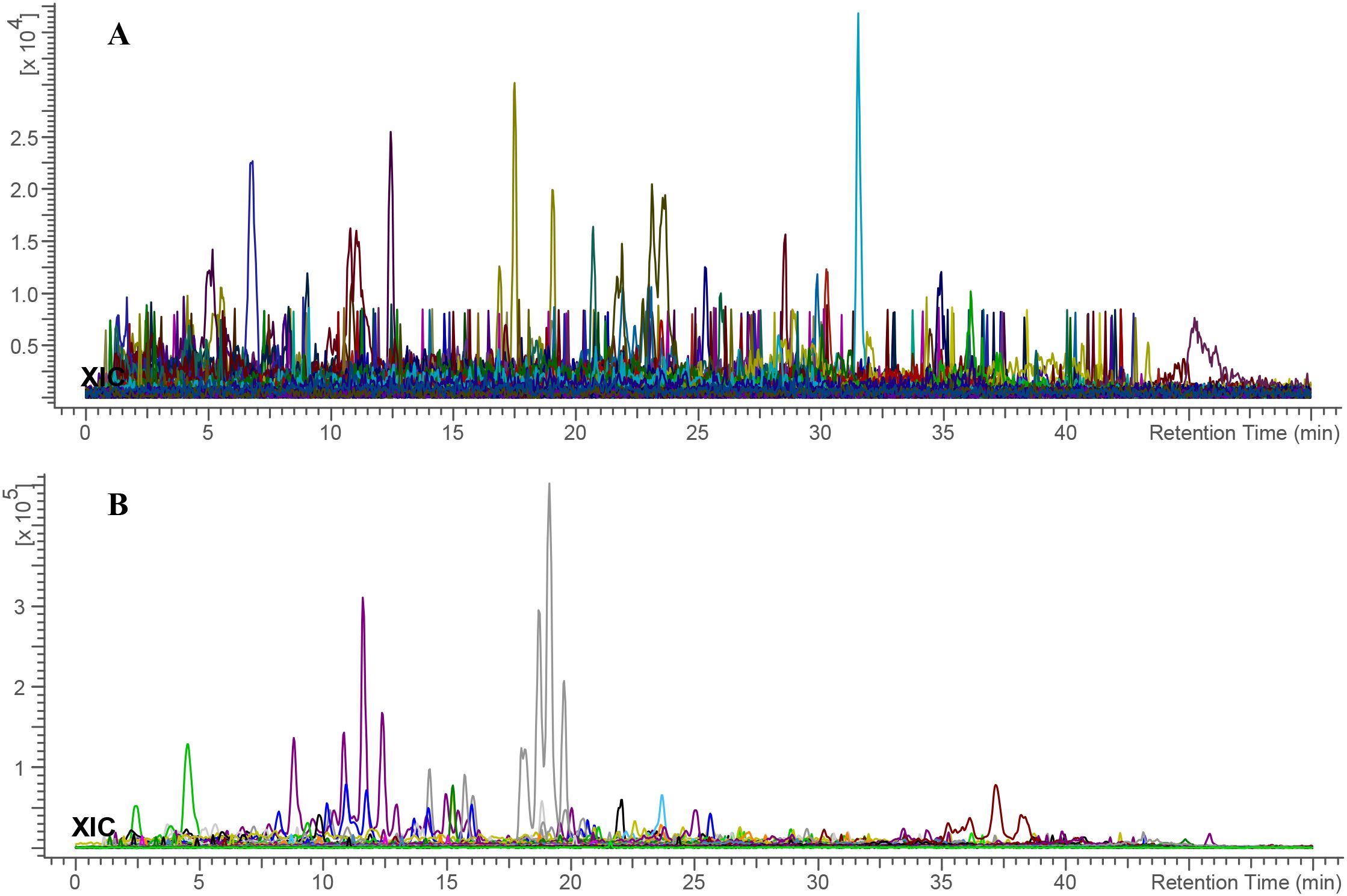Figure 8. Total ion chromatogram of E. billardieri extract in (A) positive and (B) negative ionization modes. Each color indicates a distinct m/z signal.
