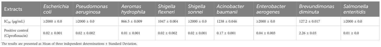 To ensure reliability, all experiments were conducted in replicate. The IC50 values were determined through nonlinear least-squares sigmoid regression curve fitting. Additionally, serial dilution agar tests were conducted to determine the minimum bactericidal concentration of the extract (Hu et al., 2022).