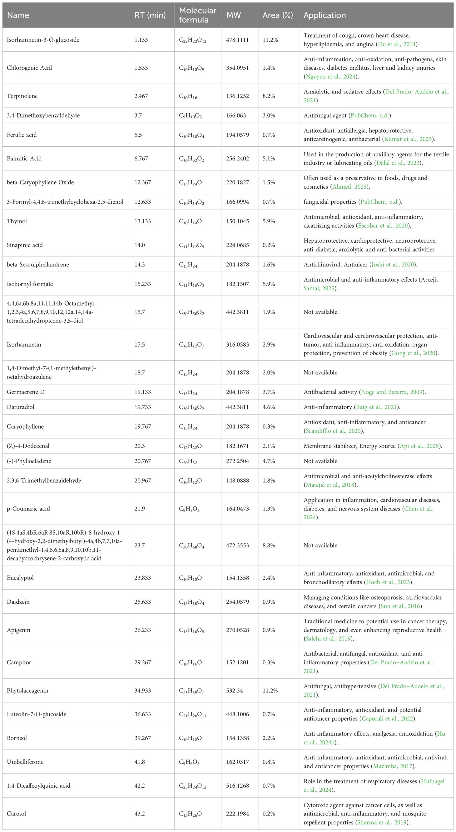 Chemical profiling of the extract revealed the presence of several terpenoids, phenolic acids, and flavonoids, including isorhamnetin 3-O-glucoside and phytolaccagenin, which exhibited the highest relative content. These compounds, along with other constituents like terpinolene and thymol, may contribute to the extract’s observed biological activities. However, bioassay-guided purification is needed to pinpoint the specific compounds responsible for each effect.