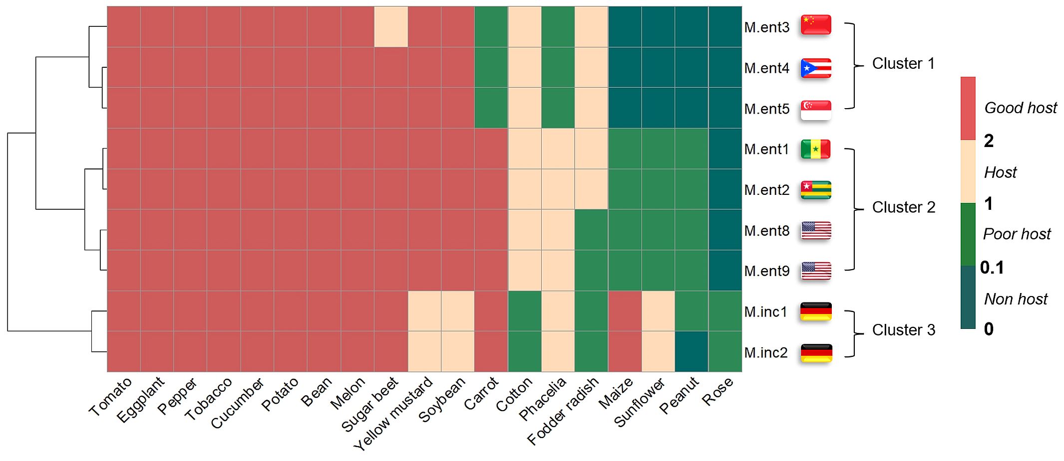 Figure 1. Heat map representing the reproduction factor (RF) of seven Meloidogyne enterolobii (M.ent) and two virulent Meloidogyne incognita (M.inc) populations across 19 different plant species. The RF class was derived from the RF means and standard deviation of individual treatments, used to depict clustering and the host status for different populations. The RF class was categorised into four groups: RF class 0 (non-host) when RF = 0 and ≤0.1; RF class 1 (poor host) when RF >0.1and ≤1; RF class 2 (host) when RF >1 and ≤ 2 and RF class 3 (good host) when RF >2. Data from two experiments were pooled (n=10) and subjected to non-parametric Kruskal-Wallis test and pairwise Wilcoxon test. The clustering of populations was performed by the ‘hclust’ function and the ‘Ward.D2’ method. Flags represent the geographical origin of populations.