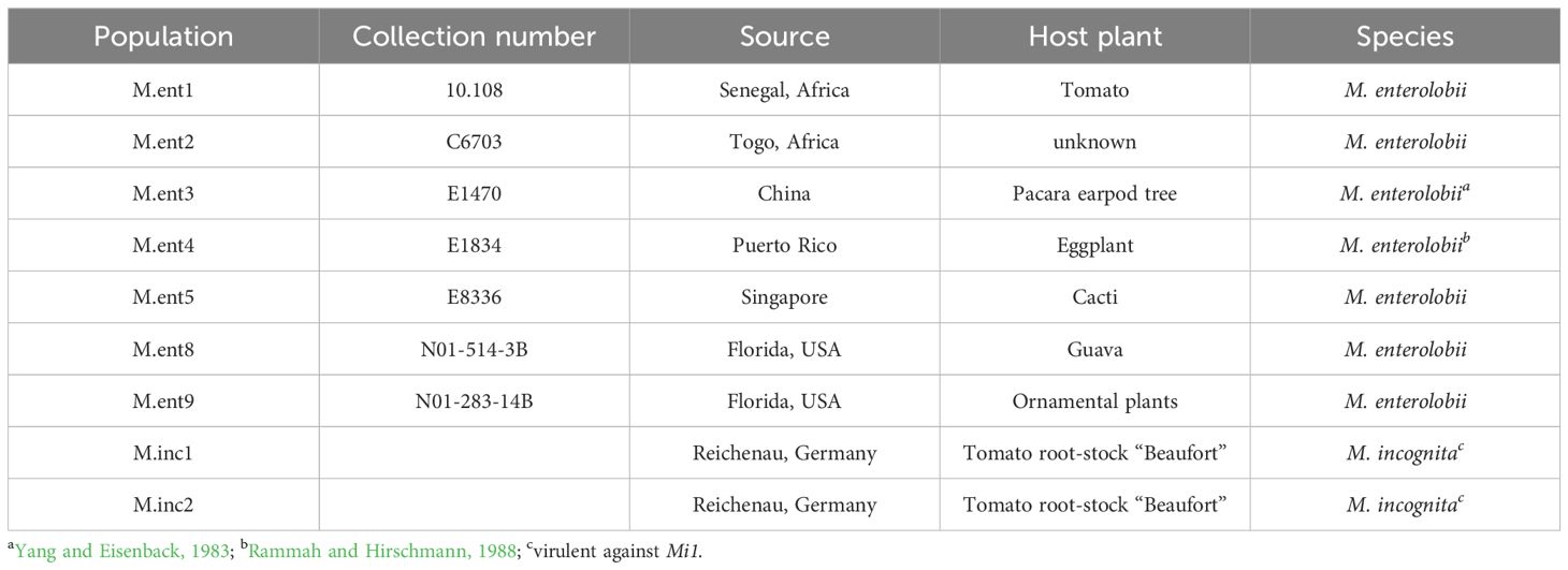 In previous studies, only M. enterolobii populations from the same geographical region were compared for virulence and pathogenicity on different host plants or host plant genotypes (Schwarz et al., 2020; Gaudin et al., 2023; Salazar-Mesta et al., 2023), but no or only minor differences were observed.