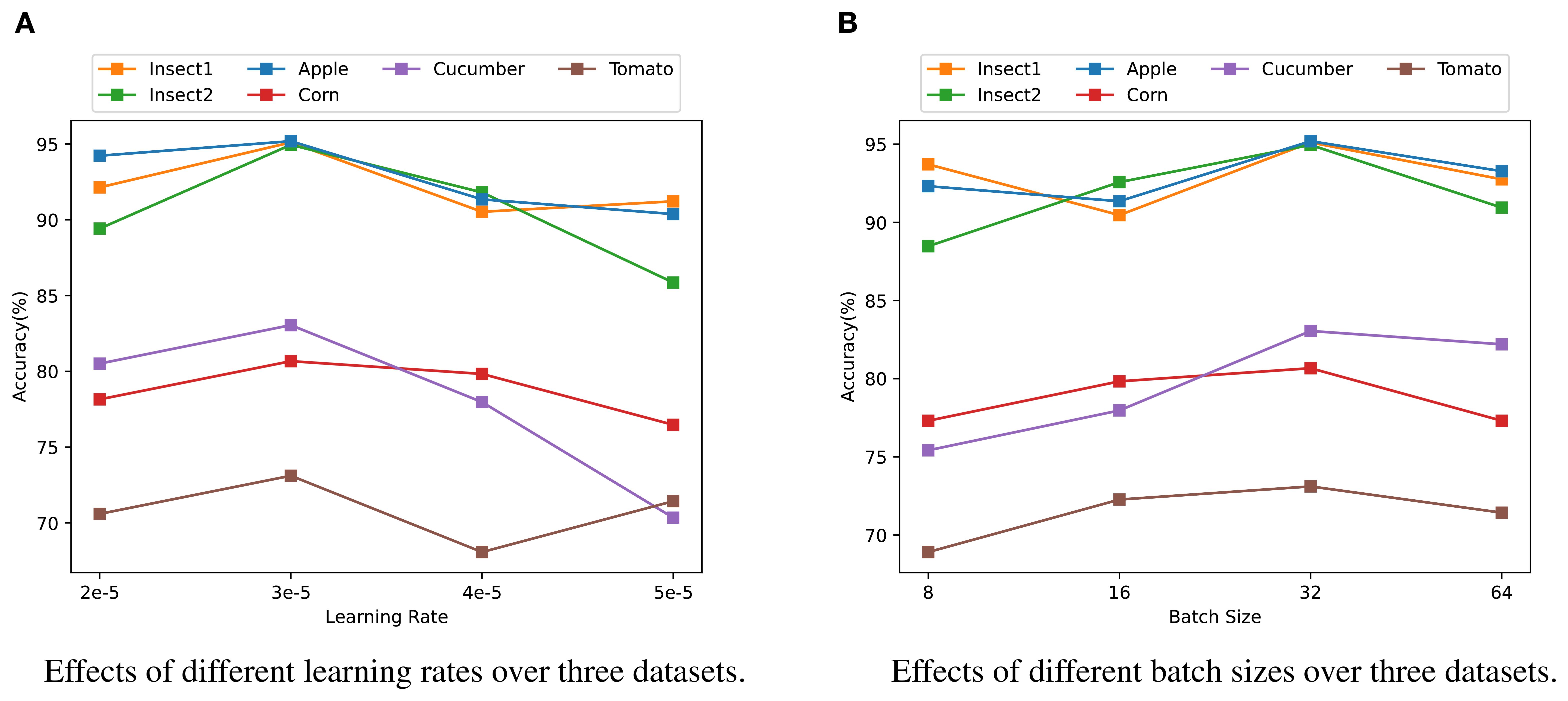 Figure 4. Analysis of model parameter sensitivity on three datasets. (A) Effects of different learning rates on the accuracy across three datasets (Insect1, Insect2, Apple, Corn, Cucumber, Tomato). (B) Effects of different batch sizes on the accuracy across the same three datasets. Different colors represent different categories: orange for Insect1, green for Insect2, blue for Apple, red for Corn, purple for Cucumber, and brown for Tomato.