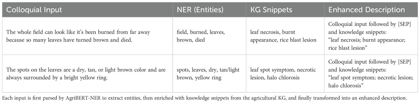 To further illustrate this process, we provide two running examples in Table 1. Each input is first parsed by AgriBERT-NER to extract entities, then enriched with compact knowledge snippets from AgriKG, and finally concatenated into the enhanced description. As shown in the table, the pipeline effectively aligns colloquial farmer expressions with formal agronomic terminology, leading to accurate classification results.