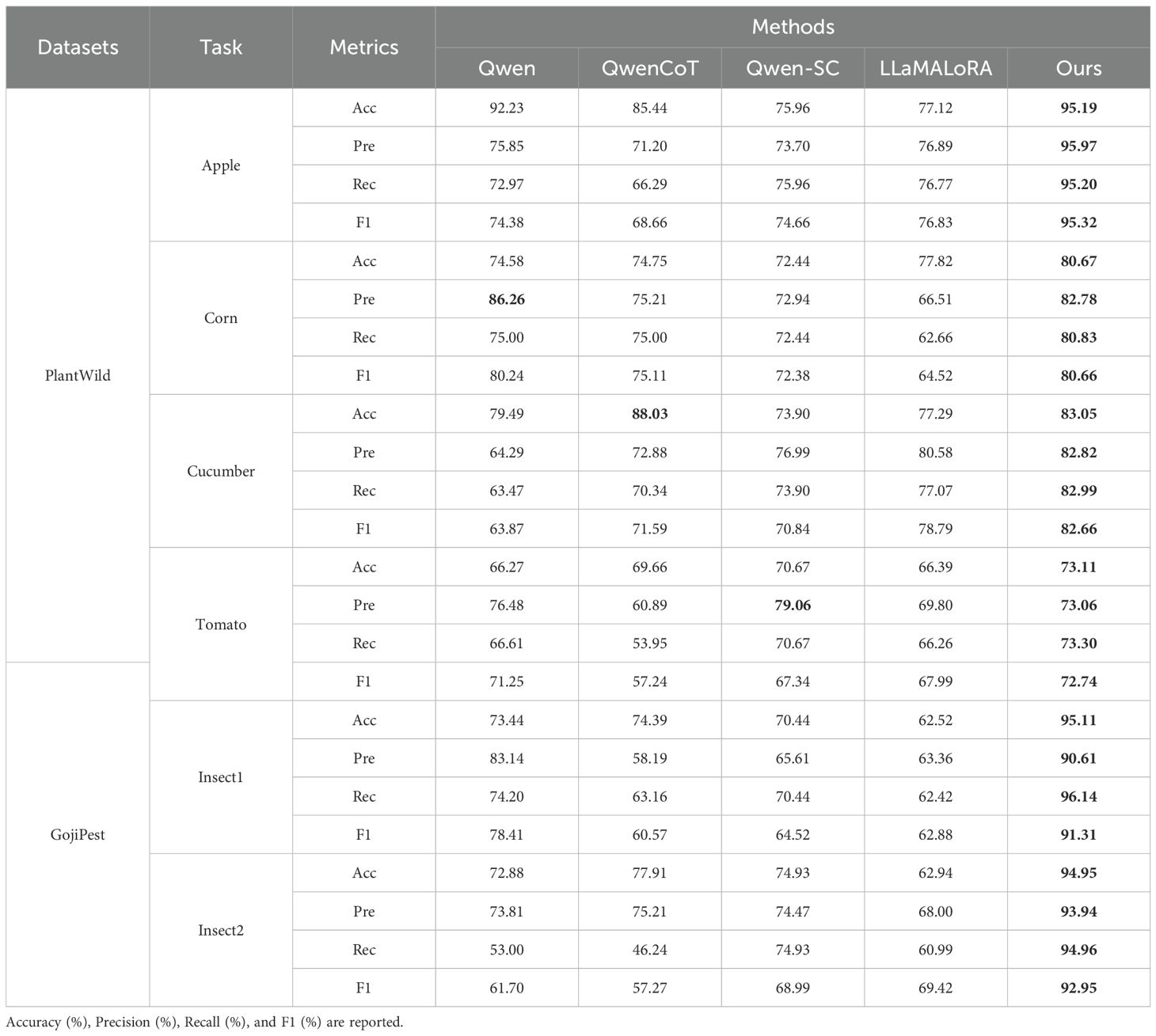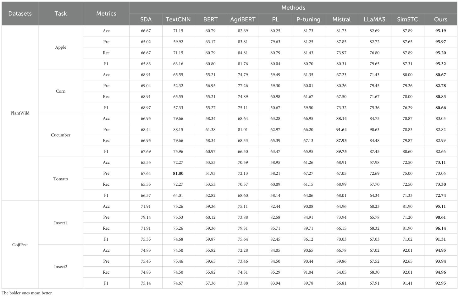 Recently, to overcome the limitations of single-modal approaches, there have already been some efforts on exploring multi-modal learning frameworks for plant pest and disease classification, which integrate heterogeneous data sources, such as images, textual descriptions, sensor data, and environmental metadata (Yang et al., 2021). This paradigm aims to enhance the robustness and contextual awareness of classification systems (Liu et al., 2025a). For example, Wei et al. proposed a multi-modal transformer architecture for citrus pests and diseases classification, where both image and text features are encoded and aligned through a cross-attention mechanism, enabling improved retrieval and identification performance (Wei et al., 2023). Similarly, Duan et al. introduced a multimodal system combining RGB images, text data, and environmental cues to facilitate pest detection and classification, demonstrating superior performance over image-only models, especially in complex agricultural scenarios (Duan et al., 2023). Wang et al. proposed Agri-LLaVA, an advanced multimodal assistant enriched with domain knowledge, designed specifically for managing 108 agricultural pests and diseases. Agri-LLaVA is trained on an extensive multimodal dataset, containing more than 221 varieties of pests and diseases, amounting to roughly 400,000 data samples. By integrating domain-specific knowledge into its training process, Agri-LLaVA demonstrates superior performance in both multimodal agricultural dialogue and visual comprehension, offering innovative solutions to tackle pest and disease challenges in agriculture (Wang et al., 2024b). These approaches leverage the complementarity of modalities, while images provide morphological cues, textual and contextual data supply semantic and environmental understanding, which proves to be useful for fine-grained and field-based classification tasks.