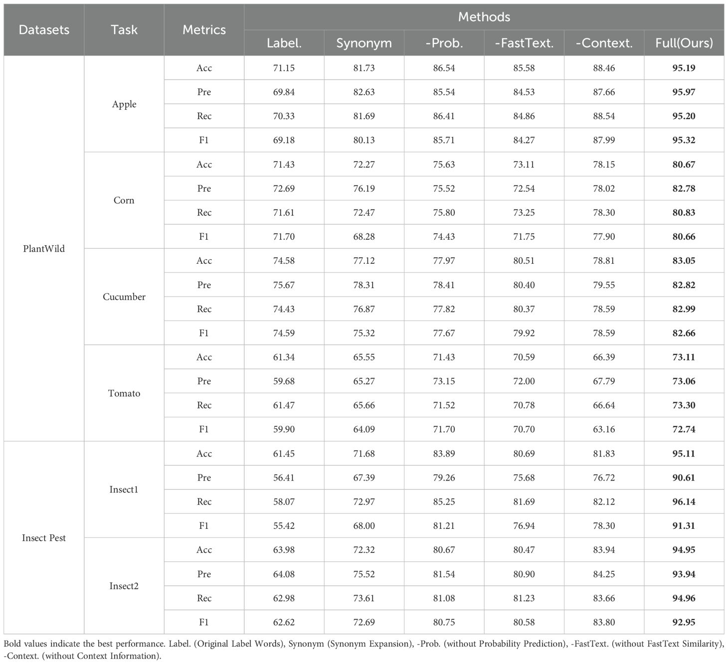 To further illustrate the effectiveness of the knowledge-enhanced verbalizer, we provide a visualization of the label word sets associated with different categories under the proposed optimization strategies. Figure 3 presents representative results from two datasets (PlantWild Apple and GojiPest Insect1). Each row corresponds to a category label, and the words in the row denote the candidate verbalizers. The symbols, which are denoted as square, circle, and star, represent filtering decisions made by removing one of the strategies, namely probability prediction (-Prob.), FastText similarity (-FastText.), and context information (-Context.), respectively. Since we take the union of the three strategies, a word is filtered out only when it is removed by all three, which results in the light-colored blocks, while the dark-colored blocks indicate the retained high-quality label words. As shown in the figure, the full model effectively preserves more informative and semantically relevant label words, while noisy or irrelevant words are gradually removed through the joint optimization strategies. This visualization provides clear evidence of how the proposed verbalizer construction improves both the richness and quality of label word sets, thereby enhancing the overall model performance.