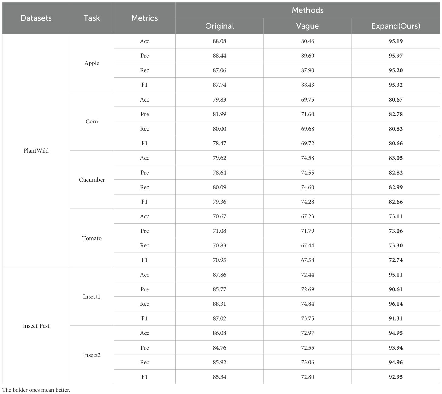 However, when “Expand” data is used, where vague descriptions are further processed, the model performance improves significantly. For example, in the Apple task, accuracy increases from 88.08 (Original) to 95.19 (Expand). Similarly, for the Corn, Cucumber, and Tomato tasks, applying our method leads to significant improvements in accuracy. This demonstrates that our expansion method effectively recovers and enhances the information in vague descriptions, improving the model’s handling of such inputs. In some tasks, the performance even surpasses that of the original data. This highlights the efficacy of our approach in enhancing classification performance, particularly in tasks such as pest detection, where ambiguous descriptions pose extra difficulties.