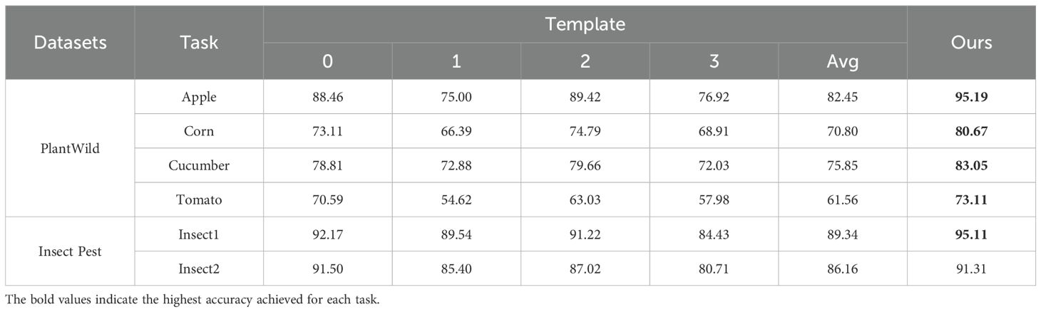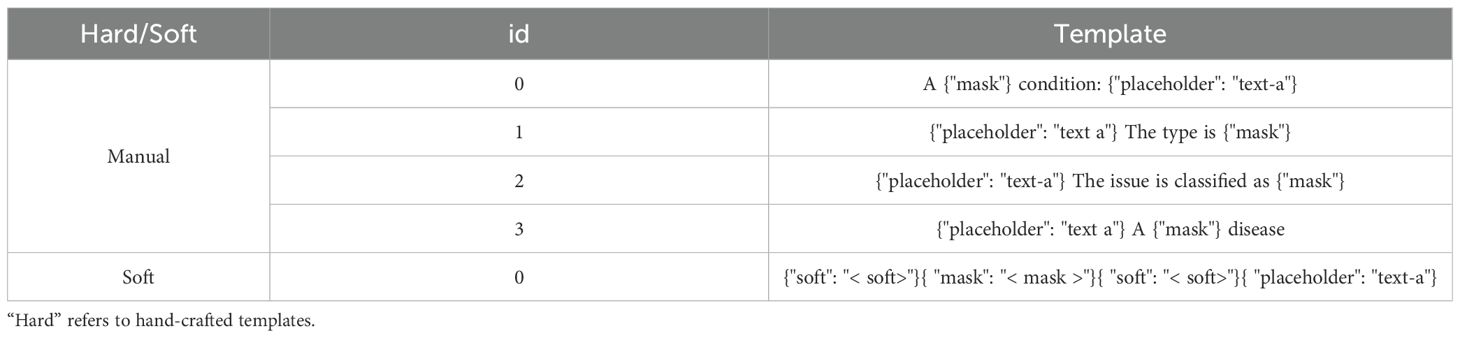 In this experiment, the design of templates was pivotal in influencing the model’s performance. To evaluate the effect of various hand-crafted and soft templates on classification tasks related to plant diseaseand pest descriptions, we created and tested several templates, the specifics of which are outlined in Table 6. These tasks involve complex short-text descriptions, requiring the model to extract meaningful features and information based on the guidance provided by the templates.