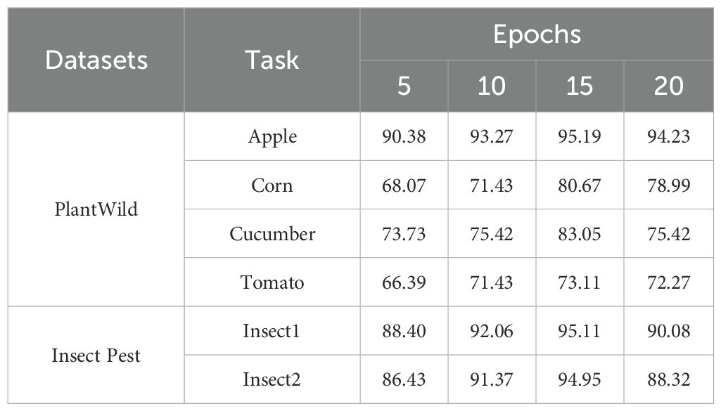 The results indicate that while model performance improves with more epochs, excessive training can lead to diminishing returns. Specifically, in the Apple task from the PlantWild dataset, the model achieved an optimal accuracy of 95.19% after 15 epochs, with a slight decrease to 94.23% at 20 epochs. Similar trends were observed for the Corn and Cucumber tasks, where the best performance was also achieved at 15 epochs, with no significant gain at 20 epochs. These findings suggest that a moderate number of epochs promotes model convergence and generalization, while too many epochs may lead to overfitting. This pattern was further confirmed in the Insect Pest dataset, where 15 epochs also yielded the best results in both Insect1 and Insect2 tasks. In conclusion, selecting an appropriate number of epochs is crucial for optimizing model performance, with 15 epochs proving to be ideal for most tasks.