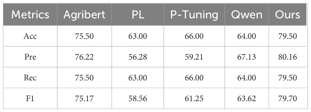 On this dataset, we conducted validation experiments using fine-tuned PLMs (AgriBERT), prompt-based learning methods (PL and P-Tuning), the LLM Qwen, as well as our proposed method. The experimental settings and parameters were kept consistent with those in the main experiments. The results are reported in Table 9. It can be observed that our method outperforms all other approaches across Accuracy, Precision, Recall, and F1, achieving an F1 Score of 79.70%, which is significantly higher than the second-best method, AgriBERT. In contrast, PL and P-Tuning perform poorly on this small-sample colloquial dataset, indicating the limited generalization capability of traditional prompt-based learning. Although Qwen performs better than the prompt-based learning methods, its adaptation to colloquial data is still insufficient without fine-tuning. Overall, our method demonstrates clear advantages in handling colloquial and standard expressions in classification tasks, providing more accurate and stable predictions across all sample categories.