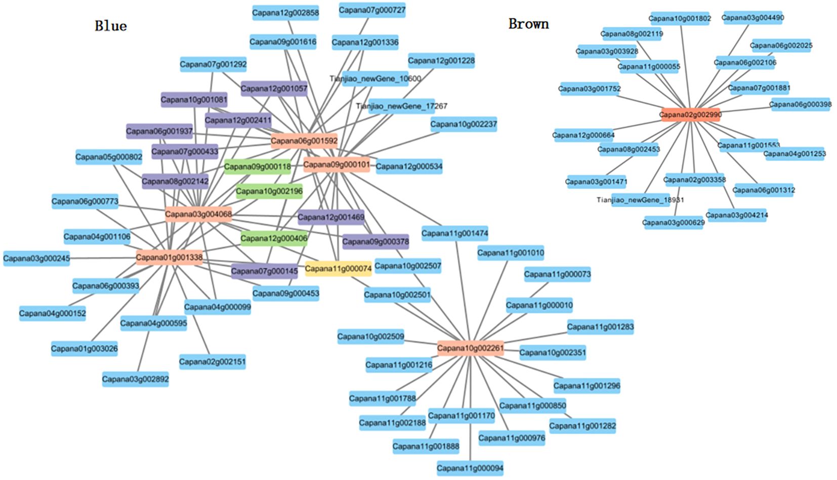 Utilizing cytoscape for construction and visualization, we delineated the interaction network of the nine core genes and their top 20 associated genes based on weight values (Figure 7). Within this network,we identified one gene (Capana11g000074) that interacts with 5 core genes.There are 3 genes (Capana12g000406, Capana09g000118, Capana10g002196) interacting with 4 core genes.Nine genes (Capana12g001469, Capana09g000378, Capana07g000145, Capana18g002142, Capana07g000433, Capana06g001937, Capana10g001081, Capana12g001057, Capana12g002411) were found to interact with 3 core genes. These 13 genes exhibit high connectivity in the co-expression network, and it is hypothesized that they may be associated with the process of pollen inactivation in sweet pepper genic male sterility.