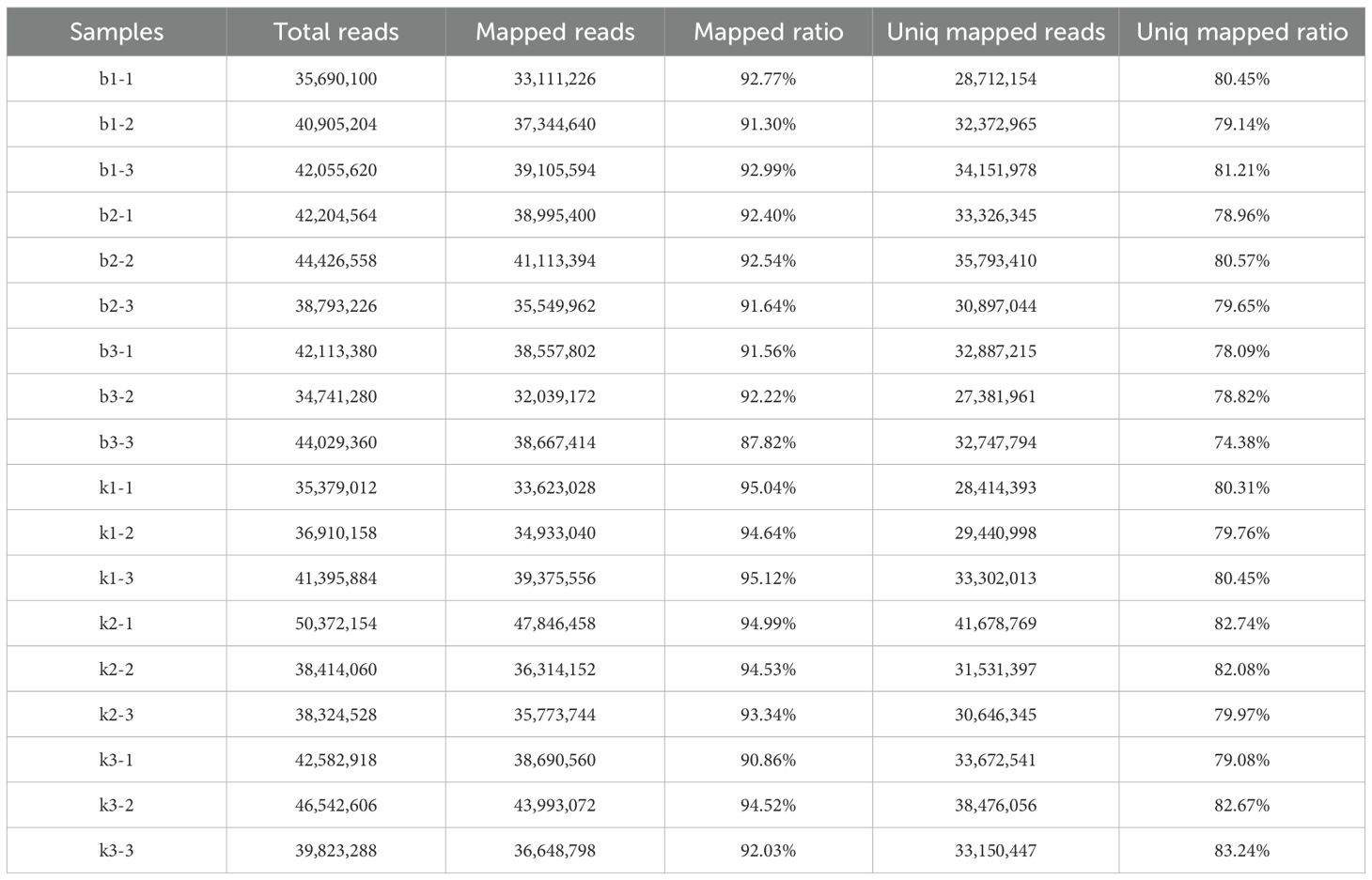 A total of 110.21Gb of Clean Data was obtained from the transcriptome sequencing, with each sample reaching 5.21Gb, and the GC ratio ranging from 42.47% to 43.73%. The percentage of Q30 was>90.71% (Supplementary Table S2). The alignment efficiency of the transcriptome sequencing Reads with the reference genome varied from 87.82% to 95.12%, and the sequencing data met the requirements for subsequent analysis (Table 2).