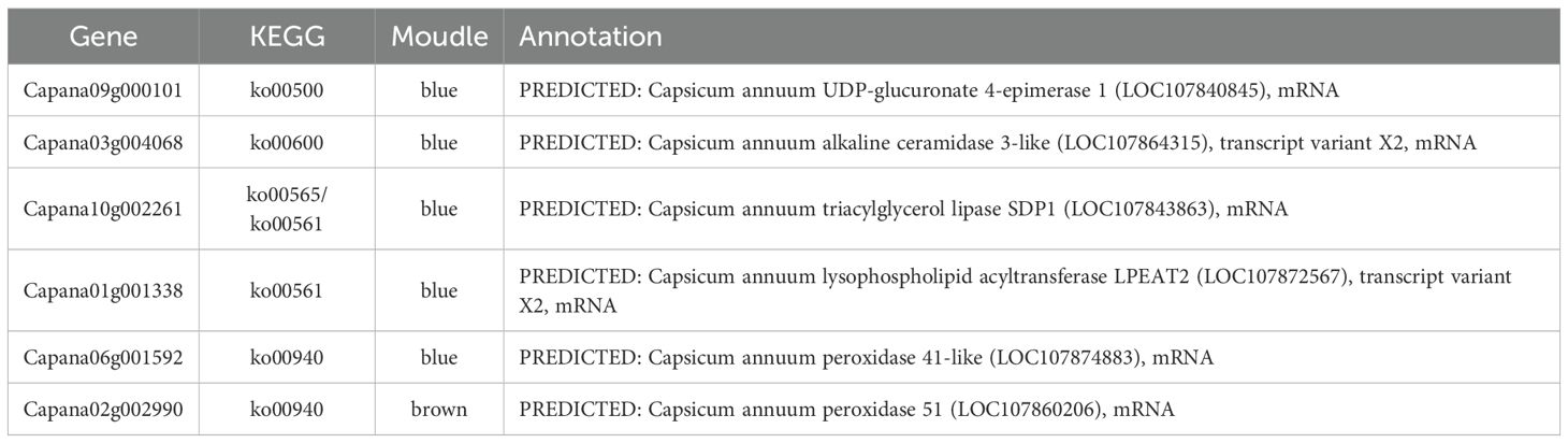 Among the blue and brown modules, there are 320 differentially expressed genes with MM≥ 0.8.The functions of these genes were predicted by comparing and annotating them with their homologous genes. The results revealed that six of these genes were enriched in five metabolic pathways: Sphingolipid metabolism (ko00600), Starch and sucrose metabolism (ko00500), Glycerolipid metabolism (ko00561), Ether lipid metabolism (ko00565), and Phenylpropanoid biosynthesis (ko00940). These six genes Capana09g000101, Capana03g004068, Capana01g001338, Capana10g002261, Capana06g001592, and Capana02g002990 can be considered as core genes associated with genic male sterility(Table 4). Notably, Capana10g002261 was enriched in two metabolic pathways (ko00600 and ko00561), suggesting that it may be located at the intersection of interrelated pathways.