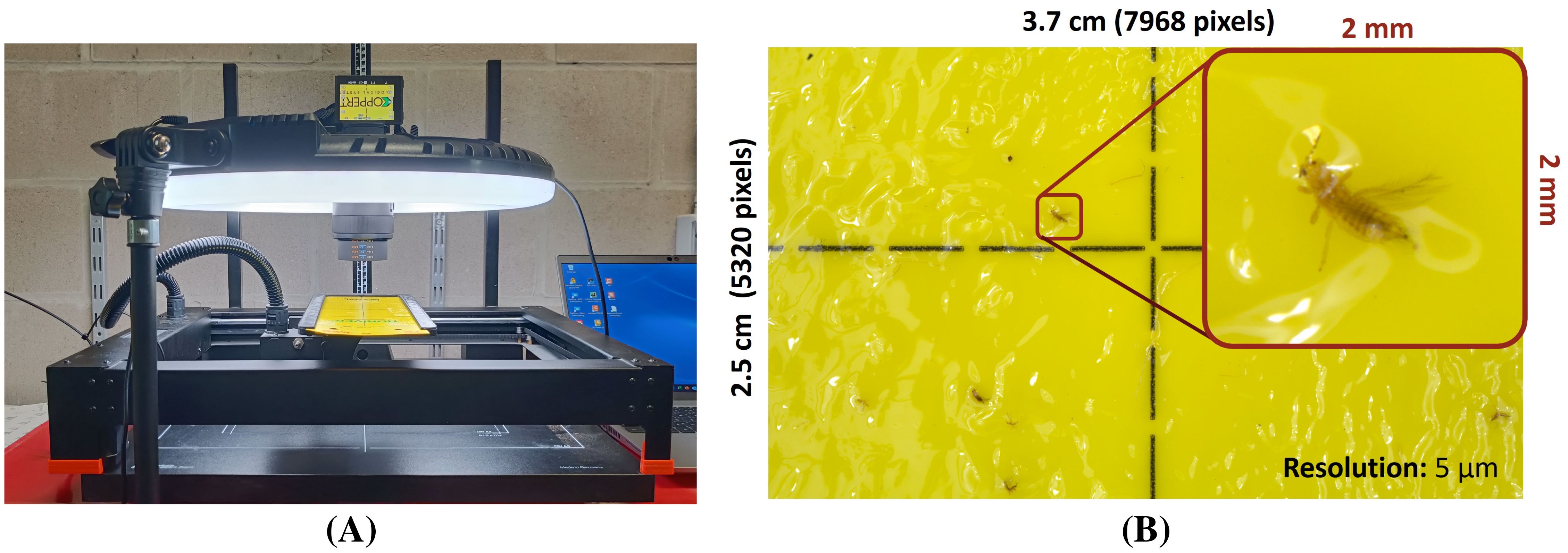 Figure 1. (A) Overview of the automated, high-resolution (pixel size: 5 µm) image acquisition setup and (B) a zoomed example image for F. occidentalis.