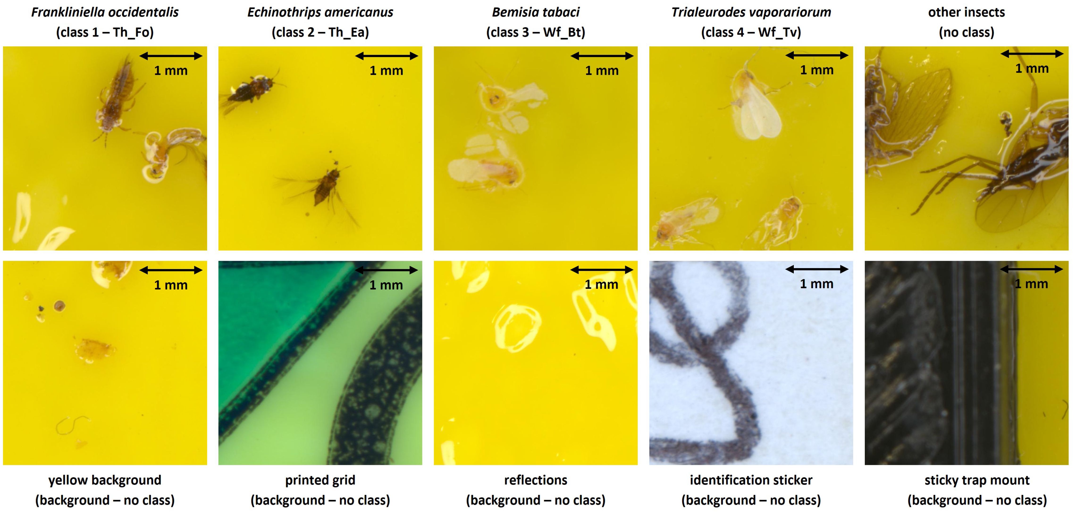 Close-up images of sticky traps are shown in a 2 x 5 grid. The top row displays various insect species, grouped per image: Frankliniella occidentalis, Echinothrips americanus, Bemisia tabaci, Trialeurodes vaporariorum, and other insects. The first four groups are roughly 1 mm in size. The insects in the other insects group are roughly 3 mm in size. The bottom row shows the background image types, being yellow background, printed grid, reflections, identification sticker, and sticky trap mount.