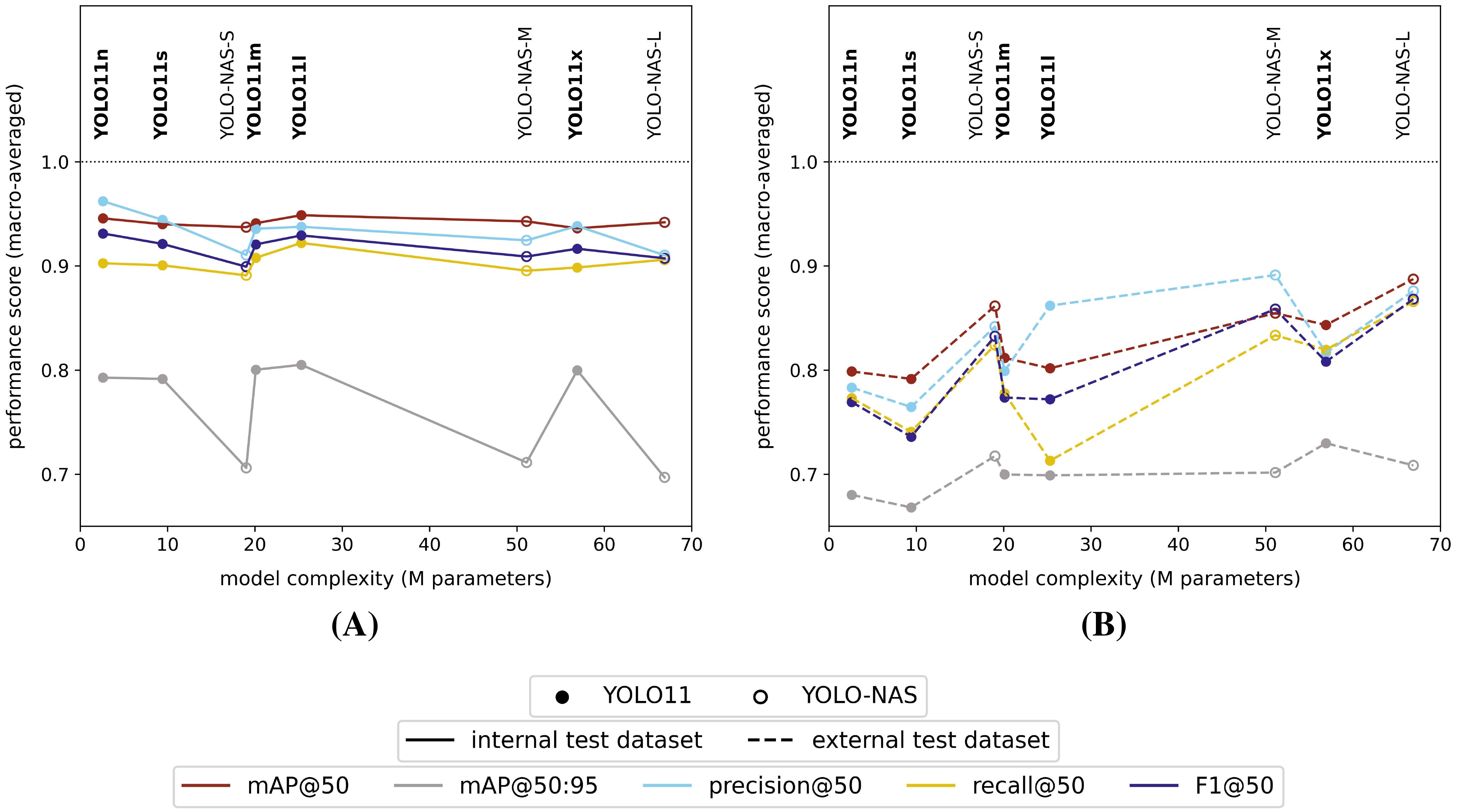 Two line charts labeled (A) and (B), comparing various performance scoresagainst model complexity for different YOLO11 and YOLO-NAS models. The following model versions are included, from low to high model complexity: YOLO11n, YOLO11s, YOLO-NAS-S, YOLO11m, YOLO11l, YOLO-NAS-M, YOLO11x and YOLO-NAS-L. Each metric is represented by different coloured lines. Chart (A) shows similar mAP@50, precision@50, recall@50, and F1@50 metrics across all models with values between 0.9 and 1.0. The mAP@50:95 scores of all YOLO11 models are situated around 0.8, while for the YOLO-NAS models they are situated around 0.7. Chart (B) shows a similar comparison, indicating increasing performance for the mAP@50, precision@50, recall@50, and F1@50 metrics as complexity increases. The values increase from roughly 0.75 to 0.9. The mAP@50:95 scores are more similar across all model versions and increase from roughly 0.65  to 0.7.