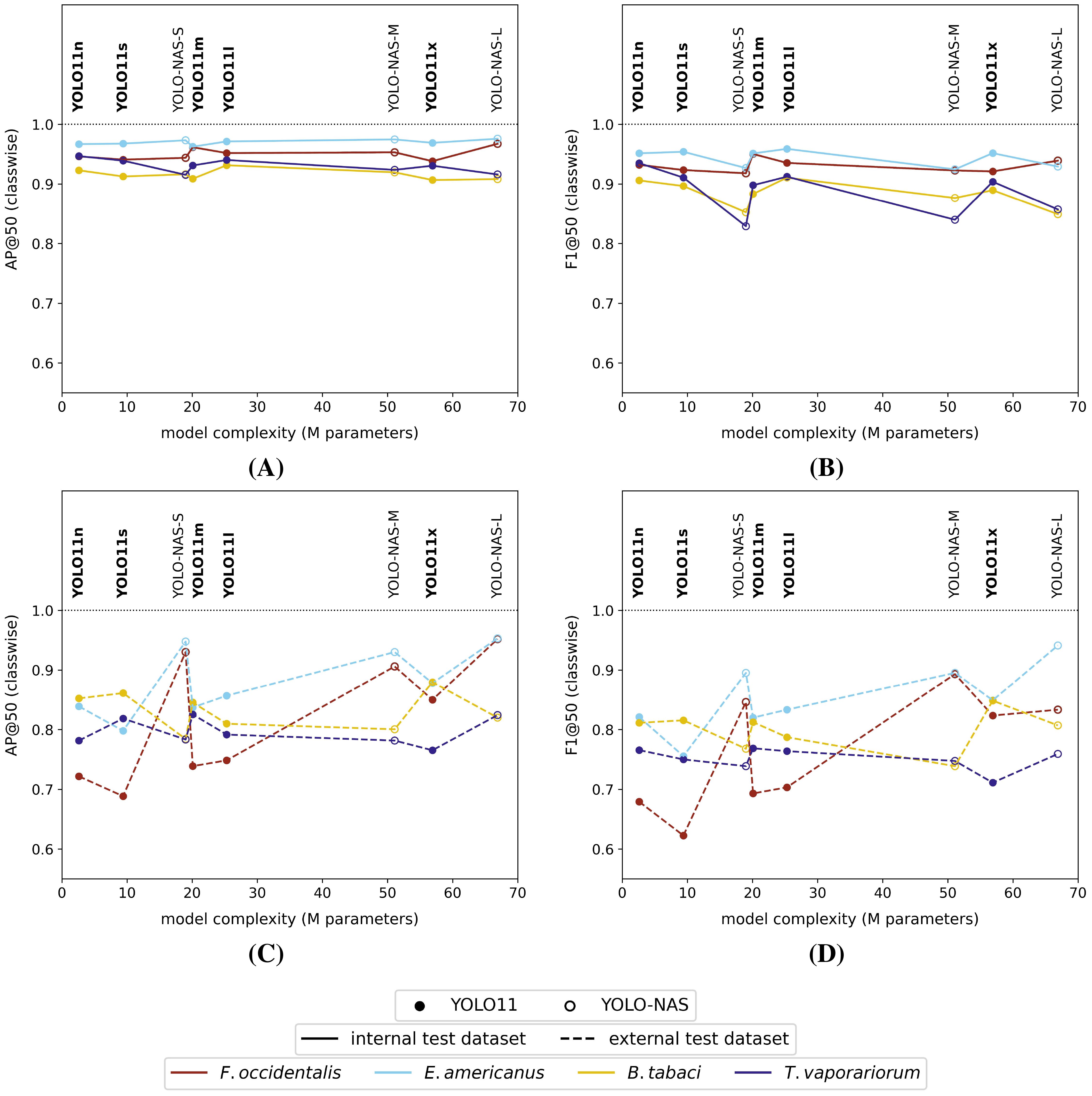However, considering the external test dataset (Figures 4C and 4D), the overall order of the best performing classes was different for the YOLO11 models, compared to the equivalent model versions, tested on the internal dataset. The general performance drop was largest for the smallest YOLO11 models (YOLO11n and YOLO11s), now performing best on B. tabaci (ΔAP@50: -7% and -5% | ΔF1@50: -10% and -8% | relative to the internal test dataset performance) and worst on F. occidentalis (ΔAP@50: -23% and -25% | ΔF1@50: -25% and -30% | relative to the internal test dataset performance). However, this effect was reduced when using more complex model versions. Apart from a performance drop compared to the internal test dataset, the order of best performing pest classes did not really change for the YOLO-NAS models. The corresponding general performance drop was clearly most significant for both whitefly species (ΔAP@50: -9% to -14% | ΔF1@50: -4% to -14% | relative to the internal test dataset performance). Once again, the precision@50 and recall@50 plots were added to the Supplementary Material File (Supplementary Figure S5C, Supplementary Figure S5D).