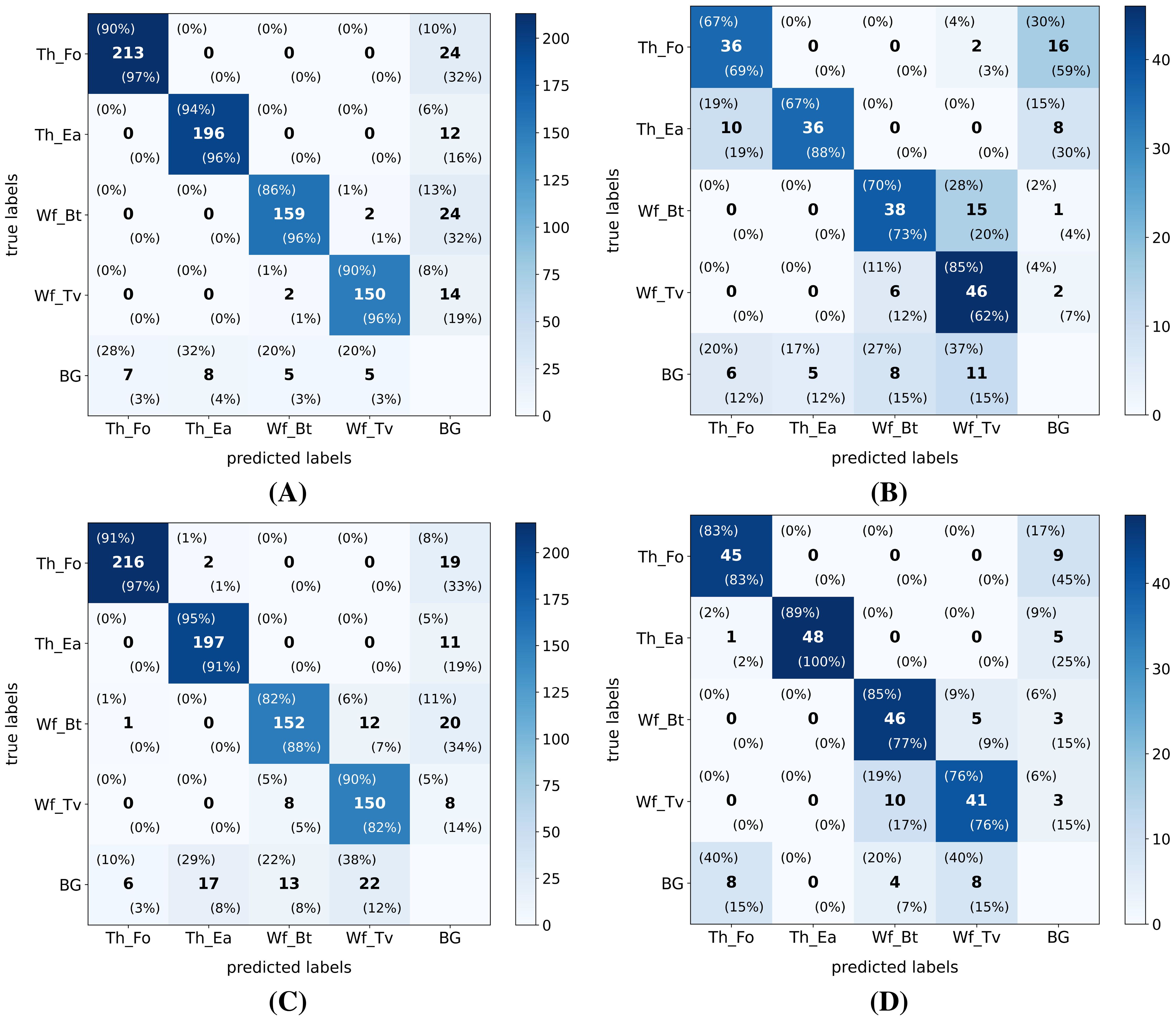 Confusion matrices (A, B, C, D) compare true labels with predictedlabels for five categories: Th_Fo, Th_Ea, Wf_Bt, Wf_Tv, BG. Each matrix shows both the absolute and relative insect counts per cell which is visually supported using a blue colour gradient. Each panel's performance varies, with emphasis on correct predictions along the diagonal and errors elsewhere.