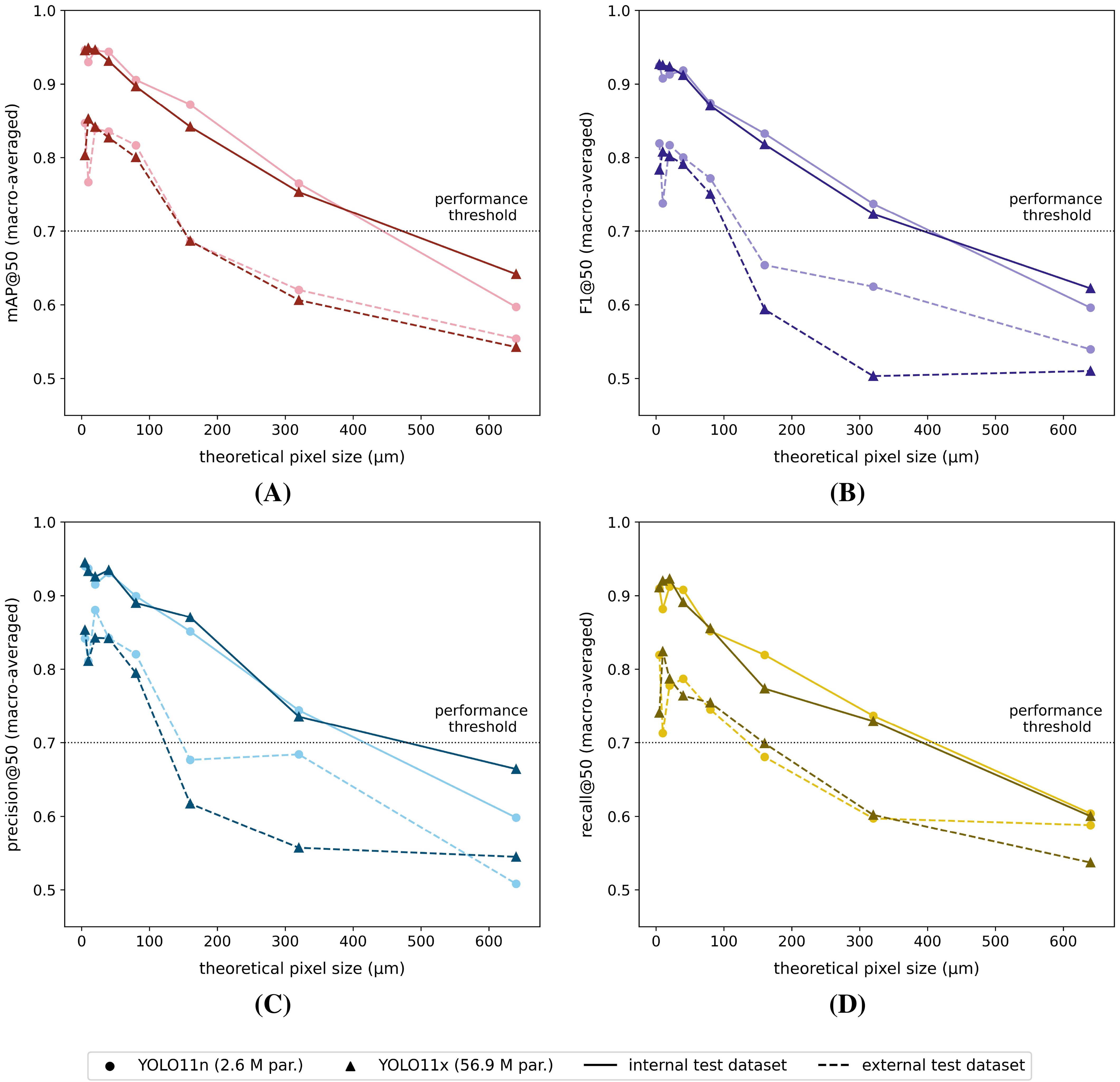 Once again, all tested models performed worse on the external test dataset, compared to the internal test dataset (Figure 6). Furthermore, the differences were generally larger for lower image resolutions (= larger pixel sizes). Both model types showed similar macro-averaged performance (mAP@50, F1@50, precision@50 and recall@50) on the internal test dataset. The model performance dropped almost linearly with increasing pixel sizes. When tested on the external dataset, both model types also performed quite similarly for the smaller (theoretical) pixel size datasets, while for larger pixel size datasets, the YOLO11n models performed generally better. Both the mAP@50, F1@50 and precision@50 scores showed a noticeable, non-linear drop at pixel sizes > 80 µm. In general, none of the reported macro-averaged performance measures (IoU ≥ 50%) dropped below 50% for the full range of studied (theoretical) pixel sizes and model architectures.