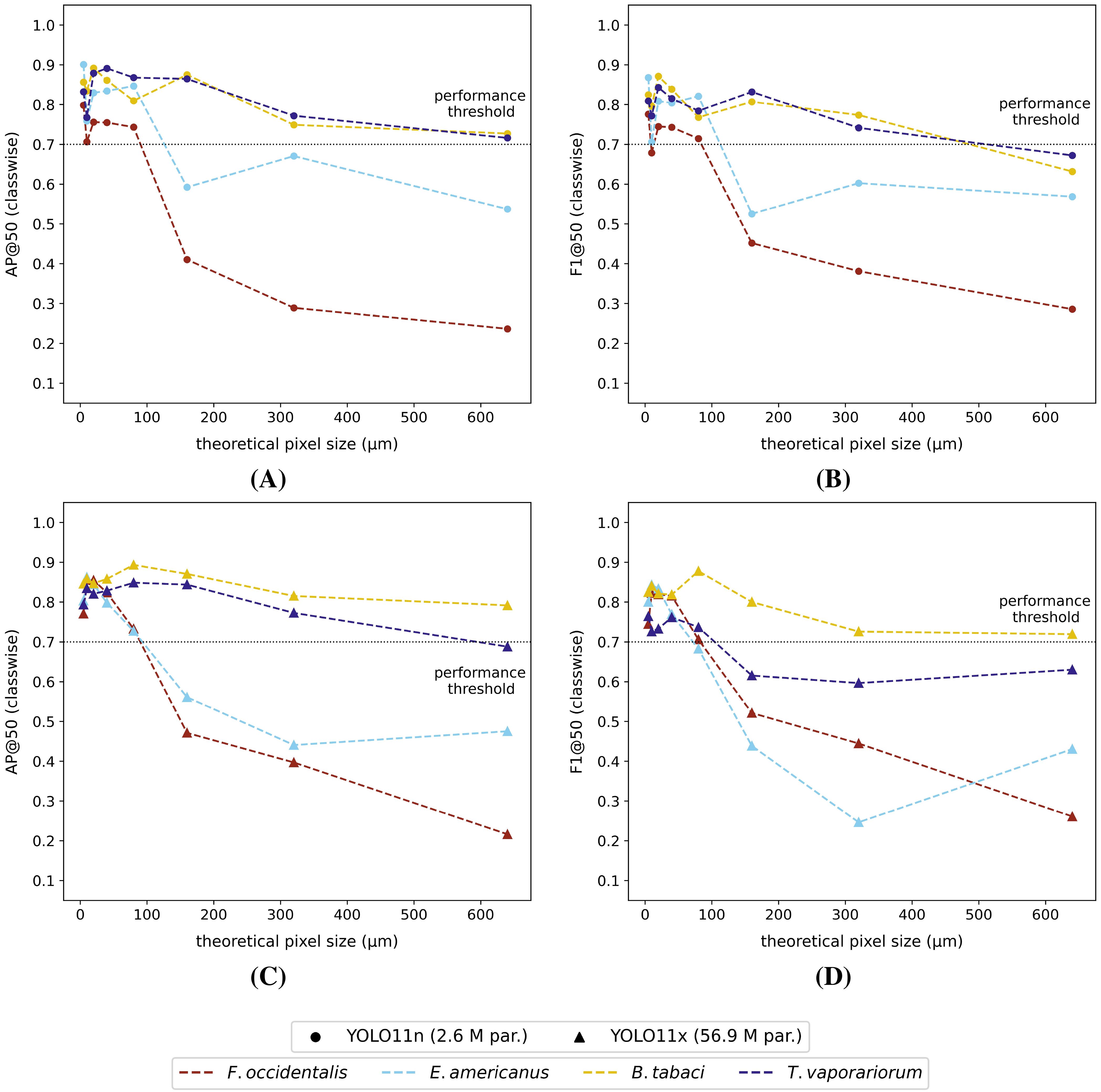 Figure 6. Macro-averaged internal/external test dataset (A) mAP@50, (B) F1@50, (C) precision@50 and (D) recall@50 performance scores for each of the YOLO11n and YOLO11x model versions, trained on the corresponding reduced-resolution internal datasets (theoretical pixel size: 5 µm - 640 µm). The black dotted line represents the arbitrarily defined minimum required practical feasibility threshold of 70% for greenhouse horticultural applications.