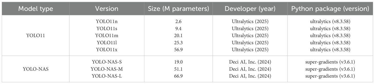 Table 1. Overview of the studied detection model versions (Aharon et al., 2024; Jocher et al., 2025) that were trained on the high-resolution (pixel size: 5 µm) internal dataset.