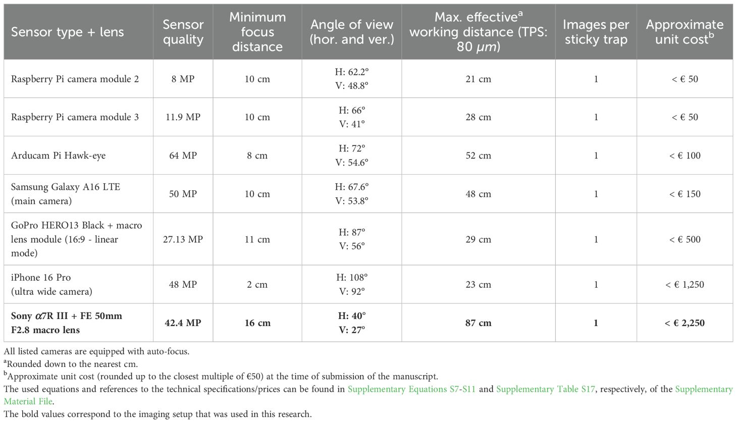 Based on the earlier defined practical feasibility threshold of 70% (or other value chosen by the reader/future user) and the obtained test metrics of each reduced-resolution model, the corresponding minimum required image resolution/maximum pixel size for species-level detection could subsequently be determined. Finally, to study the practical feasibility of stand-alone automated species-level detection traps, this value was translated into various potential minimum required photography setups. This was done using the technical specifications of the selected cameras/lenses (see Supplementary Table S17) and Equations S7–S9 in the Supplementary Material File. As the horizontal and vertical angles of view were not listed in the official data sheets of the iPhone 16 Pro and the Sony α7R III, these values were manually calculated using the diagonal angles of view, aspect ratios (width:height) of respectively 4:3 and 3:2, and Equations S10, S11 in the Supplementary Material File.