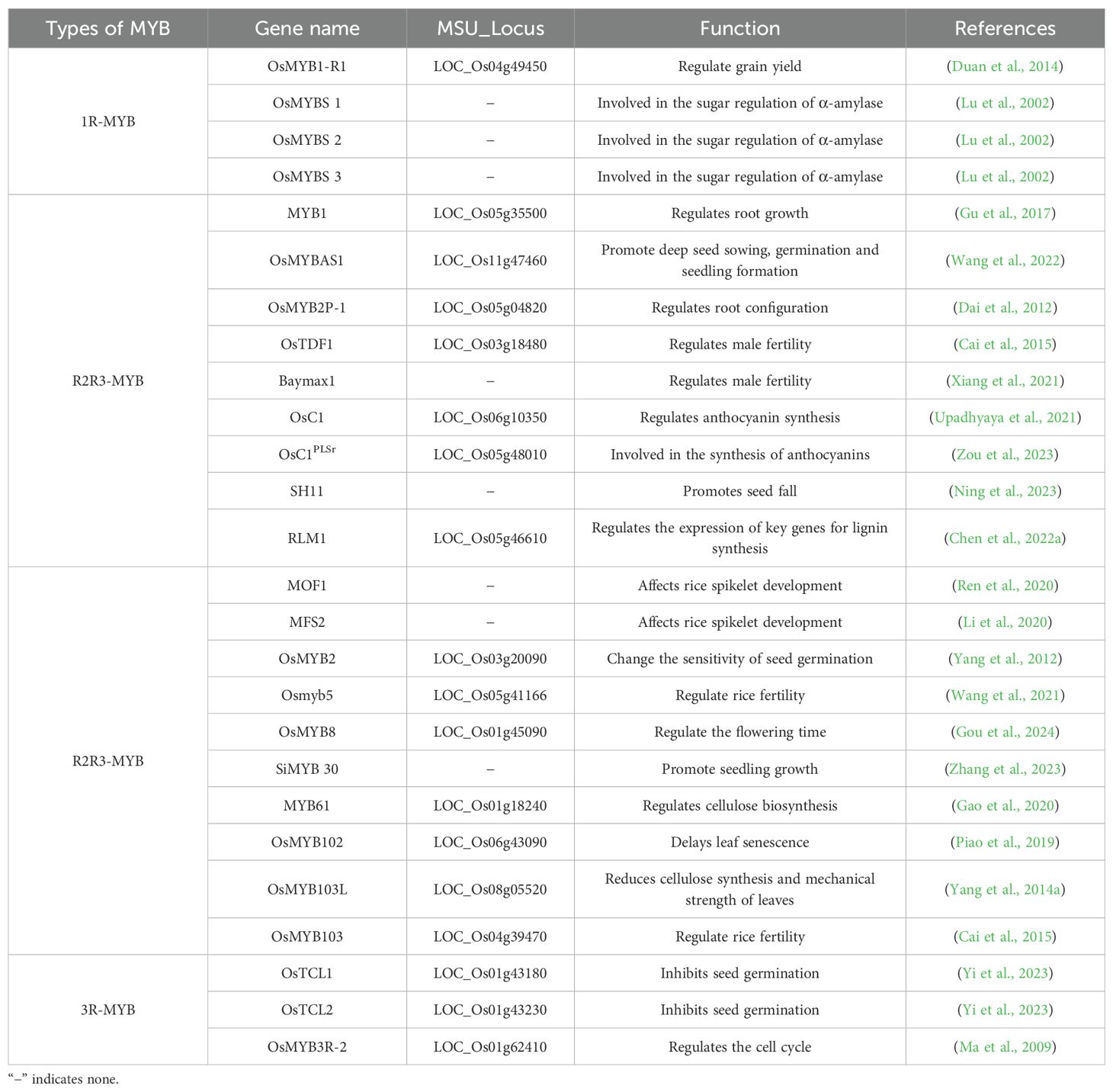 These findings indicate that MYB transcription factors regulate rice growth, development, and stress responses at multiple molecular levels, while also providing an important theoretical basis and genetic resources for rice breeding.