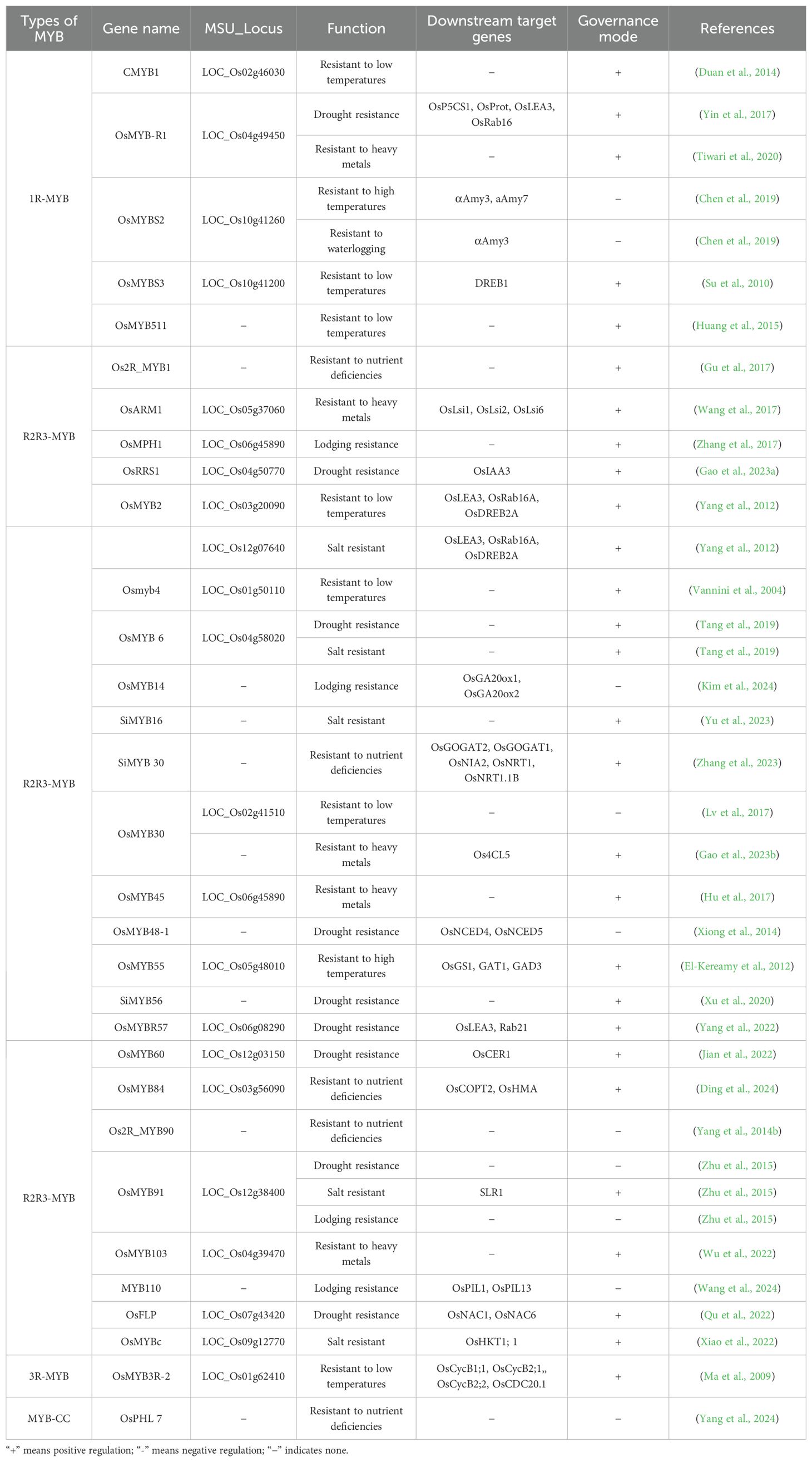 In summary, various MYB transcription factors play crucial roles in rice plant responses to abiotic stress involving complex regulatory networks, with R2R3-MYBs exhibiting the broadest functional diversity. Further research into the mechanisms underlying their functions will support the breeding of stress-resistant varieties and improve yield stability under adverse conditions.