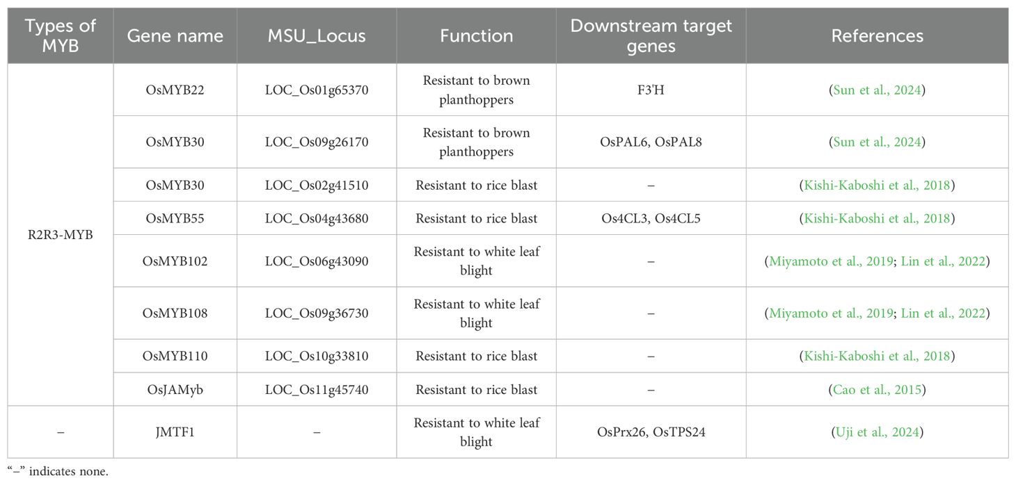 Pests are important biotic stressors affecting rice growth and development. The brown planthopper (BPH), a stinging insect endemic to rice, has been a major pest affecting rice cultivation in recent years. MicroRNAs are key regulators of plant–environment interactions. MYB transcription factors mediate rice resistance to BPH through multiple molecular mechanisms. Additionally, the OsmiR319–OsPCF5 regulatory module plays an important role in rice resistance to BPH; OsPCF5 is targeted by OsmiR319 as well as by various R2R3-MYB transcription factors, including OsMYB22, OsMYB30, and OsMYB30C (Sun et al., 2024). In terms of defense mechanisms, the R2R3-MYB transcription factor OsMYB30 increases the phenylalanine ammonia-lyase (PAL) content and promotes lignin and SA accumulation by activating OsPAL6 and OsPAL8 transcription to protect rice plants from BPH infestations. Furthermore, OsMYB30 directly up-regulates OsPAL6 and OsPAL8 expression levels (He et al., 2020).