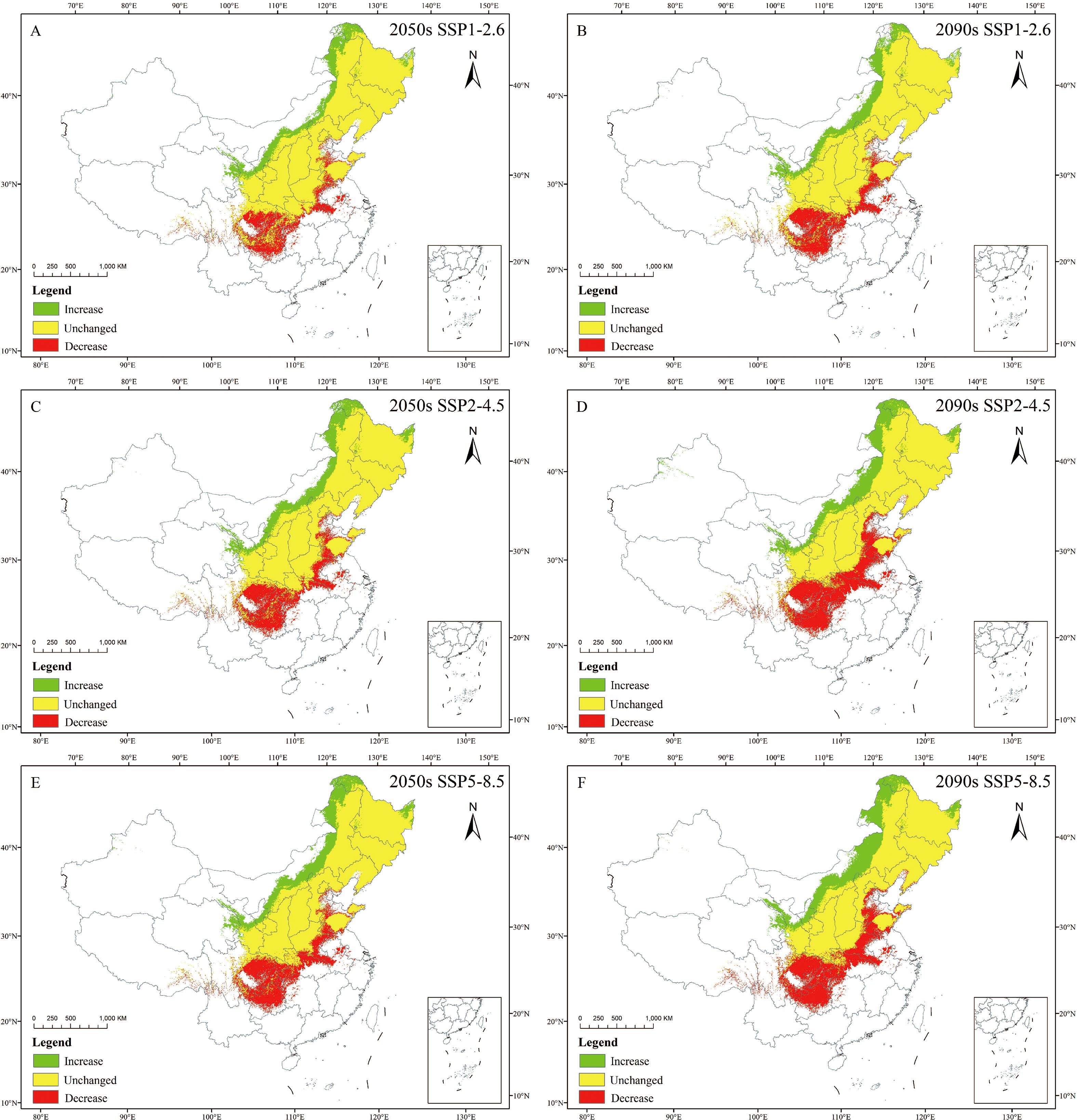 Northern Heilongjiang, Inner Mongolia, northern Qinghai, Gansu, northern Ningxia, southern Hubei, southern Hunan, southern Henan, eastern Sichuan, and southern Guizhou represent core change zones for future habitat suitability shifts in China.