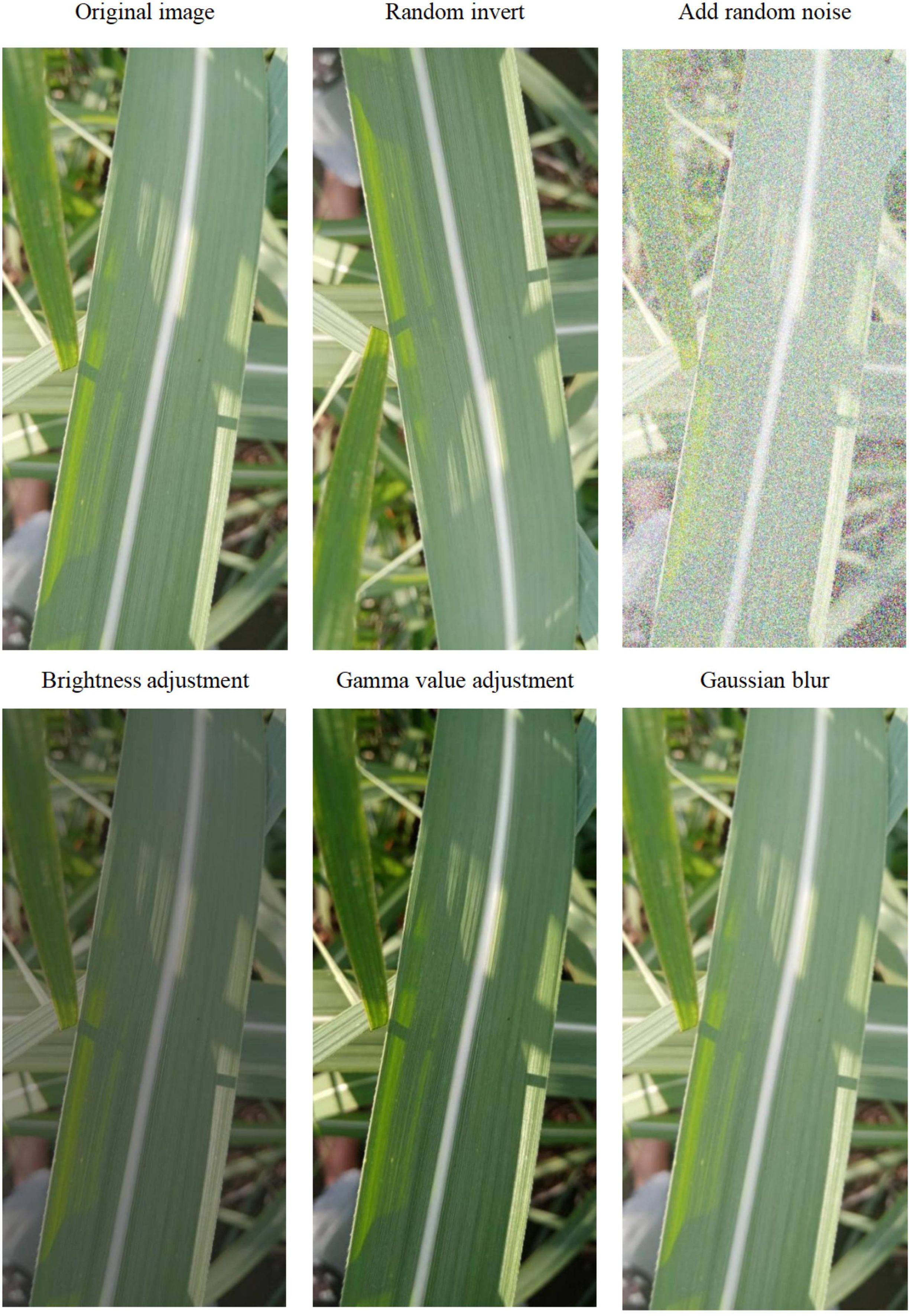 Gamma correction is a nonlinear transformation used to correct brightness deviations and contrast in images, helping to make the brightness distribution more uniform and improve visual quality. Hue adjustment can change the overall color tendency of an image, making it more aligned with detection requirements. In pest and disease detection, images are sourced from different environments and conditions.