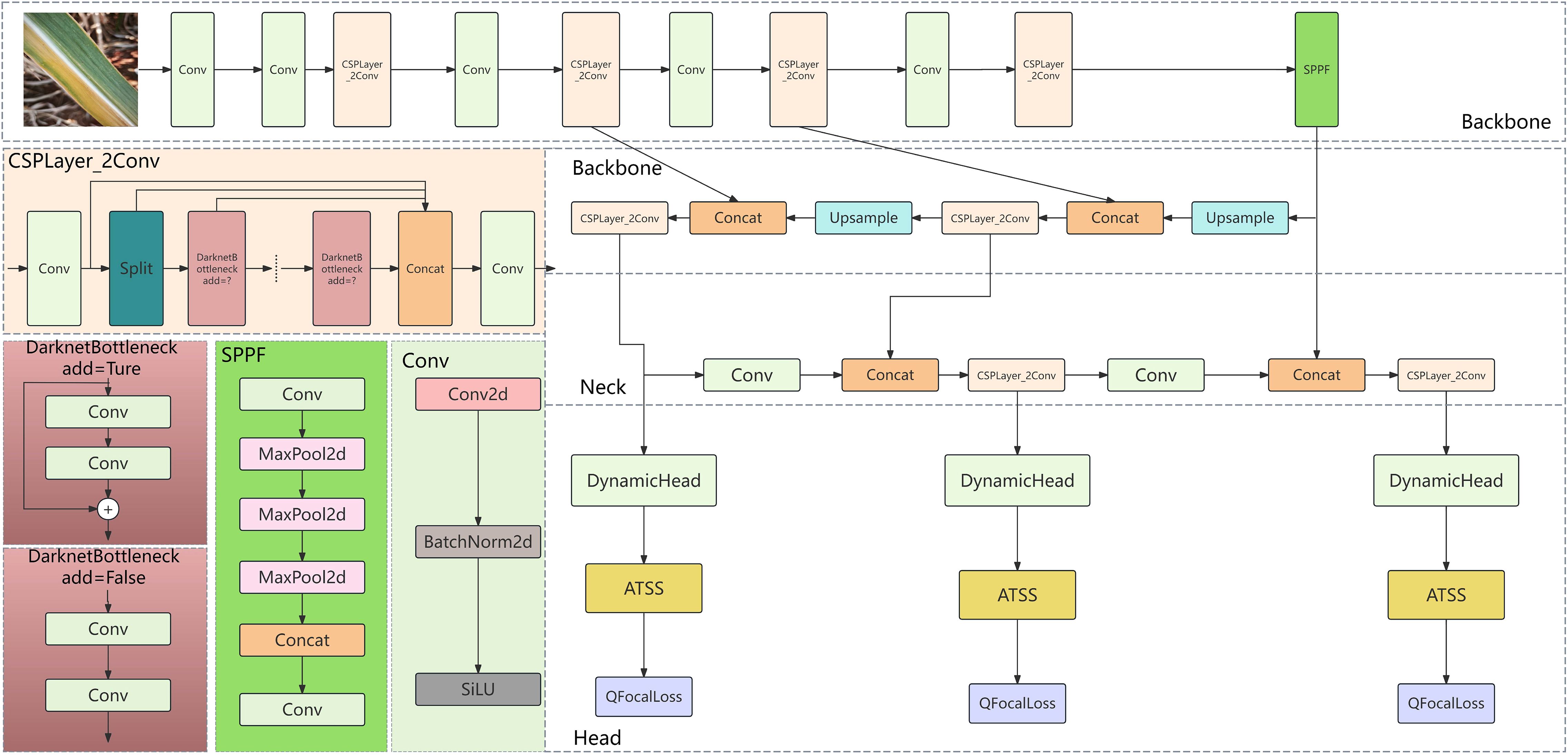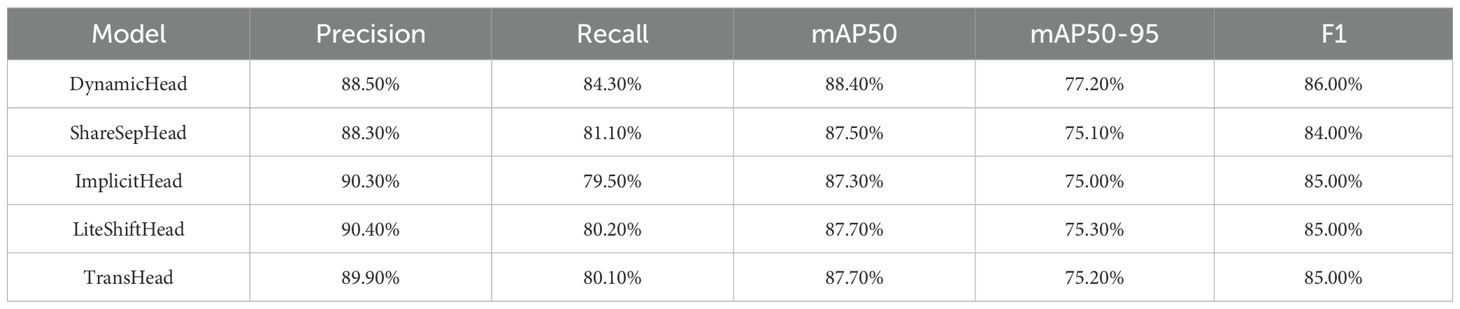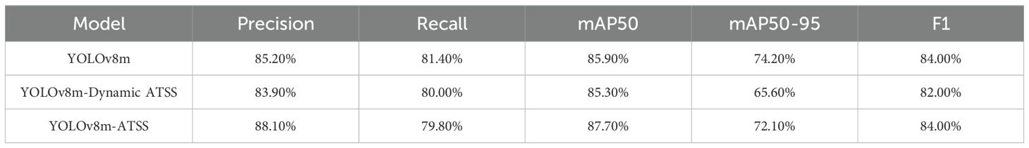 Methods: The detection head is modified to a Dynamic Head to enhance feature representation capabilities. Following the Detect module, we introduce the ATSS dynamic label assignment strategy and the QFocalLoss loss function to address issues such as class imbalance, thereby bolstering the model’s feature representation capabilities.