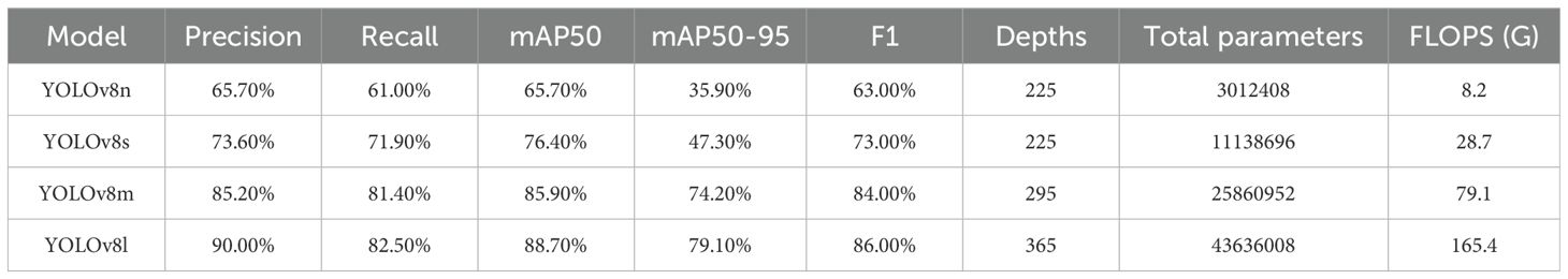 Comparative experiments were conducted on the sugarcane disease dataset using YOLOv8n, YOLOv8s, YOLOv8m, and YOLOv8l, respectively. Metrics such as accuracy, recall, mAP_0.5, F1 score, depth, parameter count, gradient, and FLOPS (G) were selected to assess the training accuracy and loss function values of the models on the test set, aiming to identify the optimal base model.