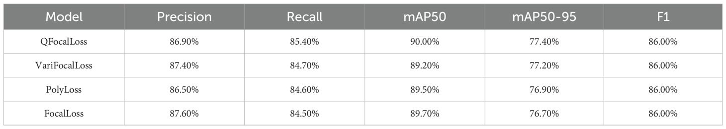 The experimental results, as presented in Table 6, demonstrate notable performance disparities among four classification loss functions in the task of sugarcane disease recognition. Notably, all four loss functions exhibited consistent performance in terms of F1 score. QFocalLoss emerged as the top performer across precision, recall, mAP50, and mAP50–95 metrics, achieving values of 86.90%, 85.40%, 90.00%, and 77.40%, respectively. This indicates that, under the current model architecture and task, QFocalLoss effectively balances the classification of positive and negative samples, thereby enhancing the model’s detection precision and recall capabilities for disease targets. VariFocalLoss demonstrated comparable performance to QFocalLoss in terms of recall, mAP50, and mAP50-95. Although PolyLoss and FocalLoss also provided satisfactory classification performance, they slightly lagged behind the former two in overall metrics. In summary, it can be concluded that QFocalLoss, when combined with ATSS and DynamicHead, offers the optimal choice of classification loss function for sugarcane disease recognition tasks, contributing to further enhancement of the model’s detection performance and practical application effectiveness.