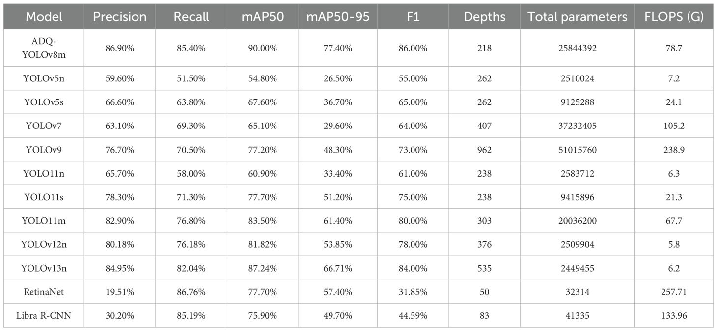 The experimental results, as presented in Table 7, demonstrate that the ADQ-YOLOv8m model exhibits significant advantages over nine other mainstream object detection algorithms. In terms of detection accuracy, the ADQ-YOLOv8m model outperforms others in precision, recall, mAP50, mAP50-95, and F1 metrics, achieving values of 86.90%, 85.40%, 90.00%, 77.40%, and 86.00%, respectively. This indicates that the ADQ-YOLOv8m model possesses the best comprehensive performance, capable of accurately locating and classifying disease targets while maintaining a consistently high detection accuracy across various detection difficulties. Compared with the latest models yorov12n and yorov13n, adq-yorov8m is superior in all key indicators, especially map50-95, which has increased by 43.7% and 16.0% respectively, showing the excellent detection ability of the model in complex scenes Compared to RetinaNet and Libra R-CNN models, it also demonstrates clear advantages: RetinaNet’s recall value is 1.36% higher than that of the ADQ-YOLOv8m model, yet its mAP50 and mAP50–95 values are both over 20% lower, and its precision is only 19.51%. This suggests that among samples predicted as disease targets, the proportion of true positives is the lowest, and the false alarm rate is the highest. The Libra R-CNN model also performs relatively poorly in various metrics, with precision being over 10% higher than RetinaNet, but sharing similar issues with RetinaNet.