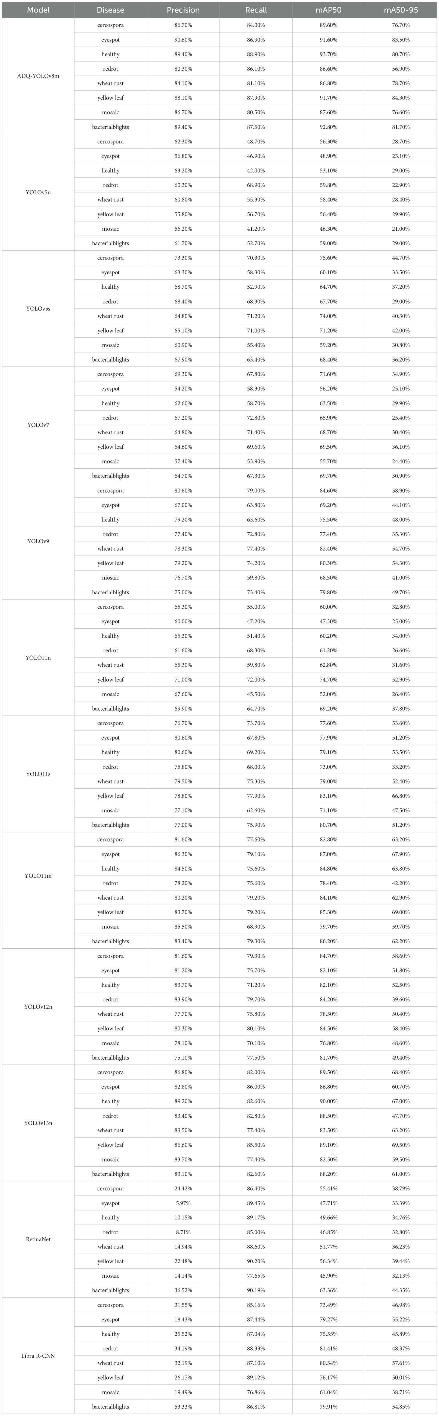 Through detailed comparative analysis with other models, it is evident that ADQ-YOLOv8m exhibits significant advantages in crop disease detection tasks. Not only does it perform exceptionally well in key metrics such as precision and recall, but it also demonstrates high performance stability across different disease categories. This superior performance is primarily attributed to the improvement of the model’s DynamicHead. Additionally, the model incorporates an ATSS label dynamic allocation strategy and a QFocalLoss loss function in its structure, better accommodating issues such as diverse target sizes and complex morphologies in crop disease detection.