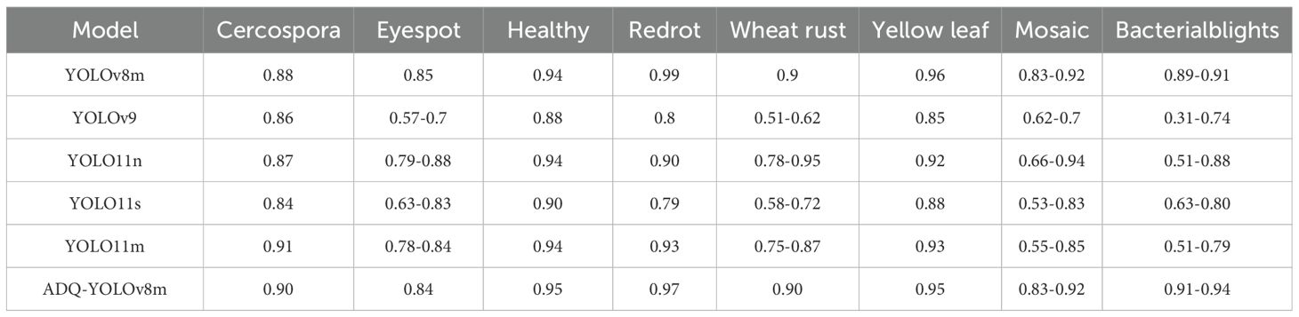 As shown in Table 9, ADQ-YOLOv8m shows significant comprehensive advantages, with an average accuracy of 0.915, higher than 0.853 of YOLO11m, and significantly higher than 0.674 of YOLOv9, 0.773 of YOLOv12n, and 0.831 of YOLOv13n. ADQ-YOLOv8m performed stably in most tasks, and the detection accuracy of “healthy” and “red rot” remained stable at 0.95 and 0.97, with stable effects; However, in the multi-target complex scenes, such as “eyespot” and “mosaic”, their accuracy rates are 0.84 and 0.83 – 0.92, respectively, better than YOLOv9’s 0.57-0.7 and 0.62 – 0.7, indicating that they have better effects in multi-target scenes. In contrast, YOLOv9’s accuracy rate in the “when trust” task ranges from 0.51 to 0.62, and the model lacks generalization ability for dense small targets. The accuracy rate of YOLOv12n in the “when trust” task is 0.58 – 0.72 (mean 0.65), slightly better than YOLOv9, but still lower than 0.90 of ADQ-YOLOv8m. The accuracy of YOLOv13n in this task is 0.75 – 0.87 (mean 0.81), but it still does not reach the level of ADQ-YOLOv8m. YOLOv11m’s accuracy rate of 0.92 in the “yellow leaf” task is slightly lower than that of 0.95 in ADQ-YOLOv8m, while YOLOv12n (0.88) and YOLOv13n (0.93) perform stably in this task, but not exceed that of ADQ-YOLOv8m. In a single target detection task (such as “health”), the differences between models are small. ADQ-YOLOv8m, YOLO11m, YOLOv12n and YOLOv13n all reach or close to 0.94, indicating that lightweight models are competitive in low complexity scenarios. The accuracy of YOLOv13n in the “mosaic” task is 0.55 – 0.85 (mean 0.70), lower than 0.83 – 0.92 (mean 0.875) of ADQ-YOLOv8m. ADQ-YOLOv8m is significantly superior to other models in “eyespot” and “bactrialblights” tasks, which further verifies its performance advantages in multi-objective processing and the reasonable balance between performance and complexity.