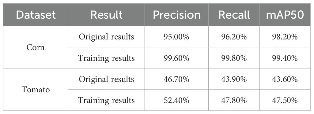 This section aims to explore the generalization capabilities of the ADQ-YOLOv8m model proposed in this study, ensuring its effectiveness and stability across various crop disease scenarios. On the Roboflow website, we selected two datasets similar to the crop disease recognition task of this study: the Corn Leaf Disease Dataset and the Tomato Disease Dataset. The Corn Leaf Disease Dataset comprises two disease categories, totaling 10,000 images, while the Tomato Disease Dataset includes 15 disease categories, with a total of 3,867 images. Neither dataset underwent image augmentation to ensure that the experimental results accurately reflect the model’s generalization capabilities. The proposed ADQ-YOLOv8m model was employed for generalization experiments, comparing the original and post-training results of the two datasets to analyze their generalization abilities. The training parameters for the generalization experiments were set as follows: image size of 640x640, batch_size of 64, epochs of 500, optimizer of SGD, label smoothness of 0.5, initial learning rate of 0.01, final learning rate of 0.0001, optimizer momentum of 0.937, and optimizer weight decay of 0.0005. The training results are presented in Table 10.