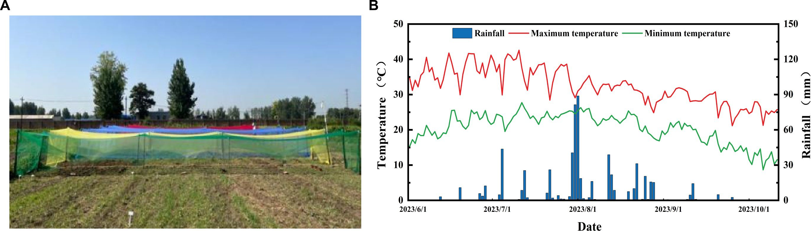 Figure 1. (A) Photographs of different photo-selective net treatments. (B) Air temperature and rainfall amount during adzuki bean planting in 2023.