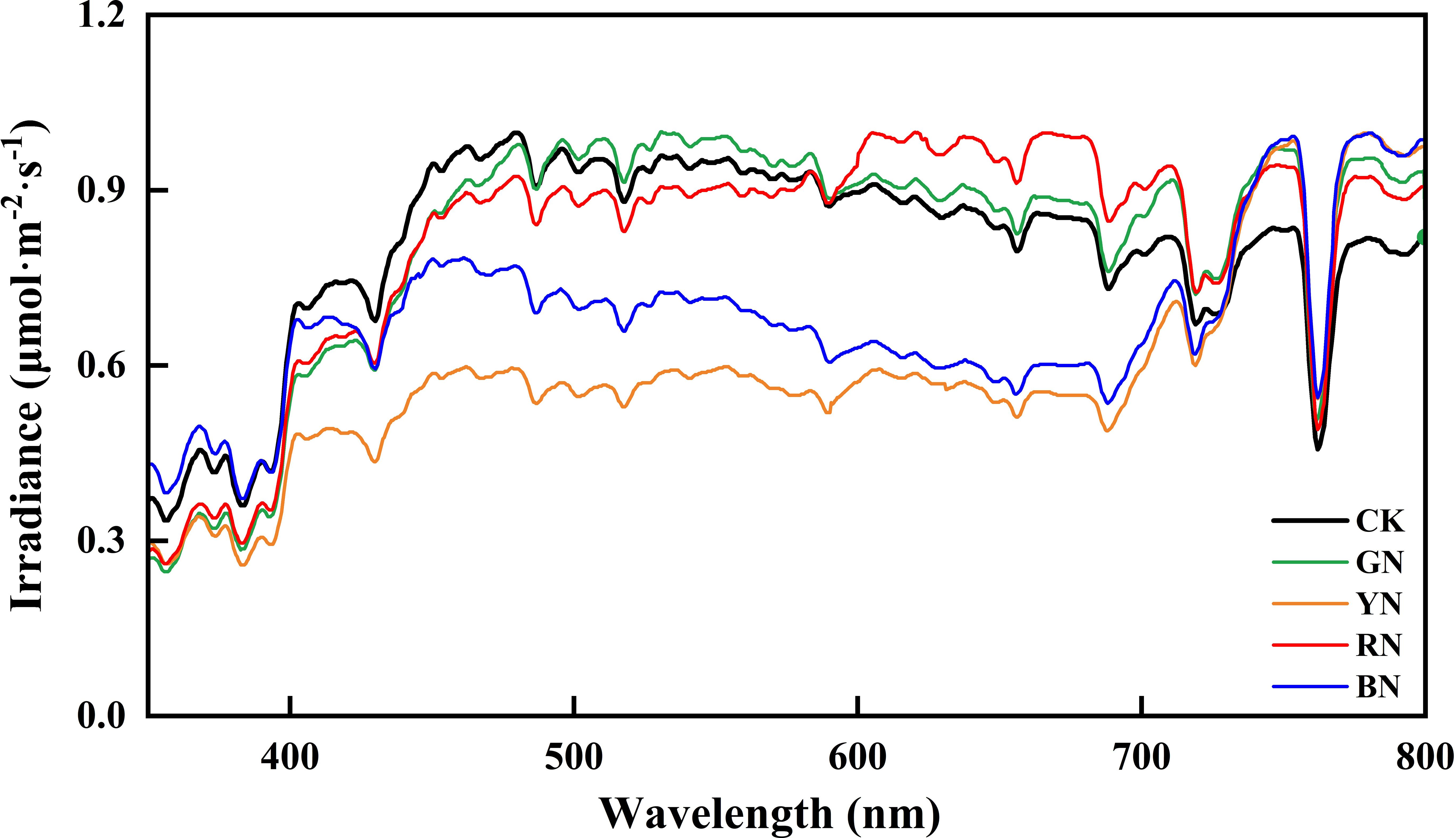 Figure 2. Spectral characteristics of different photo-selective net. CK, control; BN, blue photo-selective nets; RN, red photo-selective nets; YN, yellow photo-selective nets and GN, green photo-selective nets.