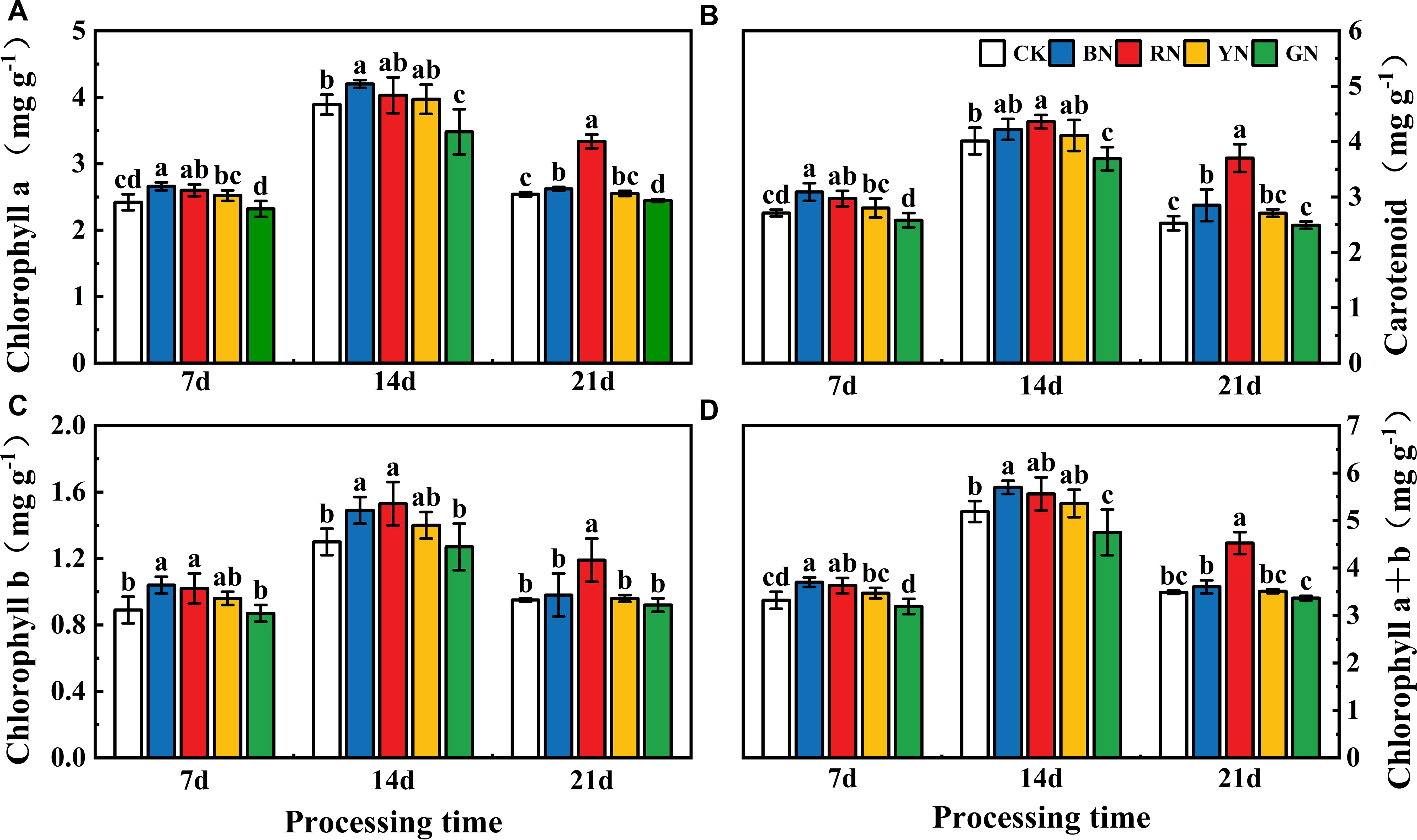Figure 3. Effects of photo-selective nets on photosynthetic pigment contents in adzuki bean leaves at different treatment times. (A) Chlorophyll a content, (B) Carotenoid content, (C) Chlorophyll b content, (D) Chlorophyll a+b content. Values represent means ± SD. Error bars denote standard deviations. Different letters (a-e) in the same column indicate significant differences among treatments at P ≤ 0.05 via Duncan’s multiple range test.